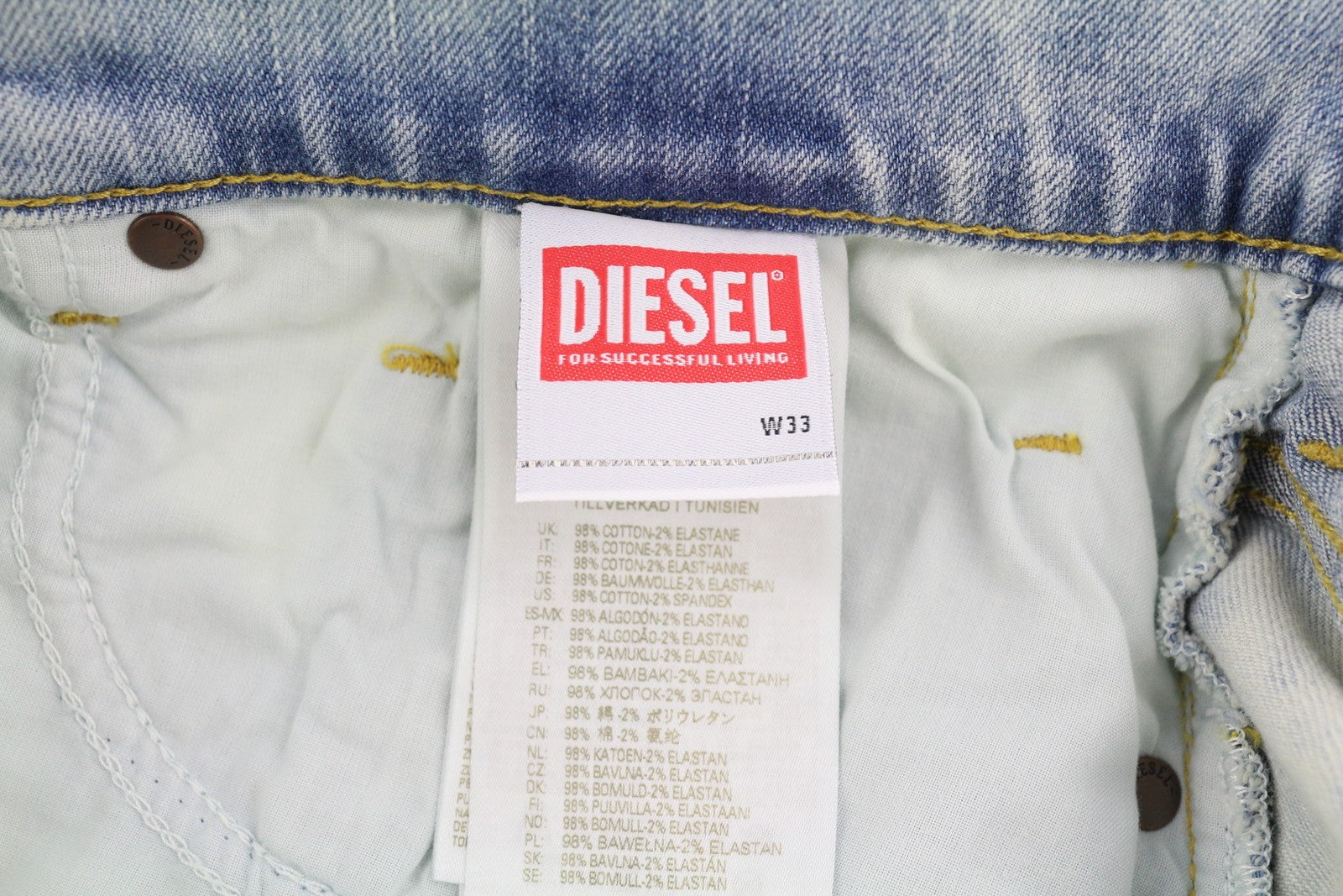 DIESEL D-Luster 0GDAM vyriški džinsai W33/L32 Slim Stretch, su sagomis, skalbtos mėlynos spalvos