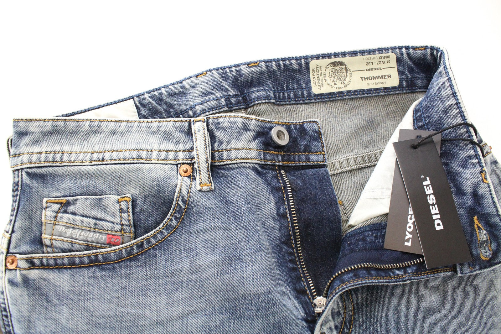 DIESEL Thommer 084UX vyriški W27/L32 akmens spalvos aptempti džinsai su dėmėmis ir užtrauktuku