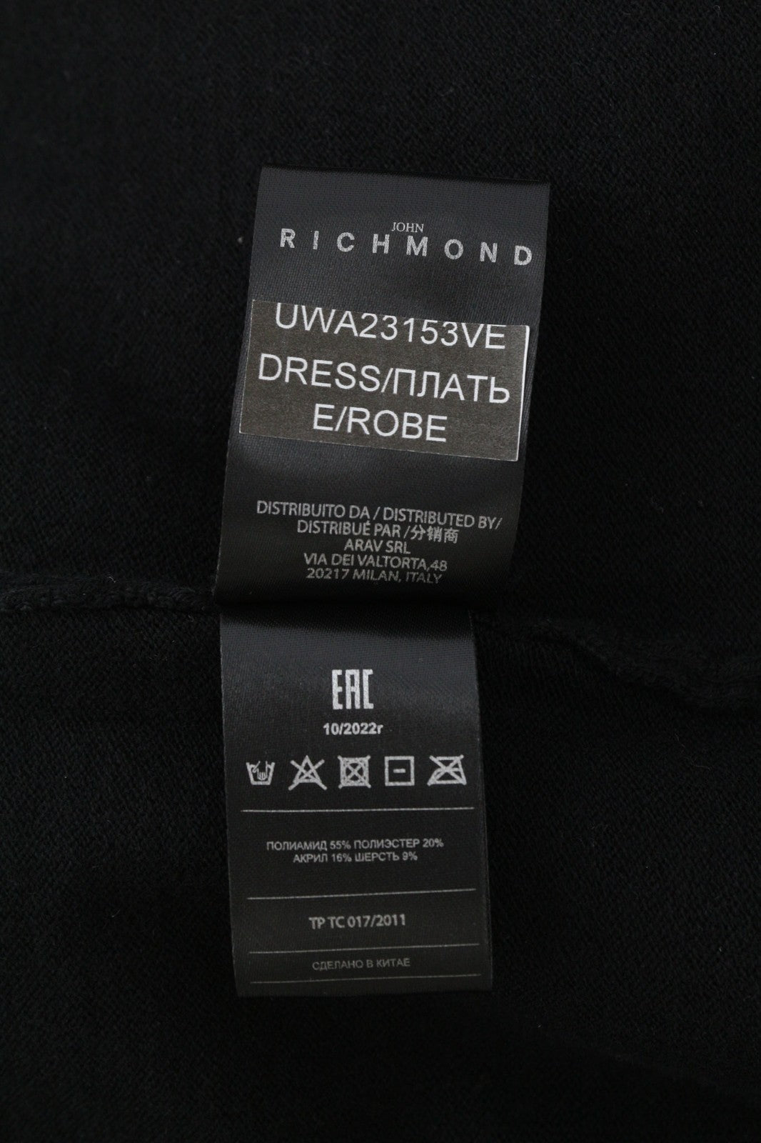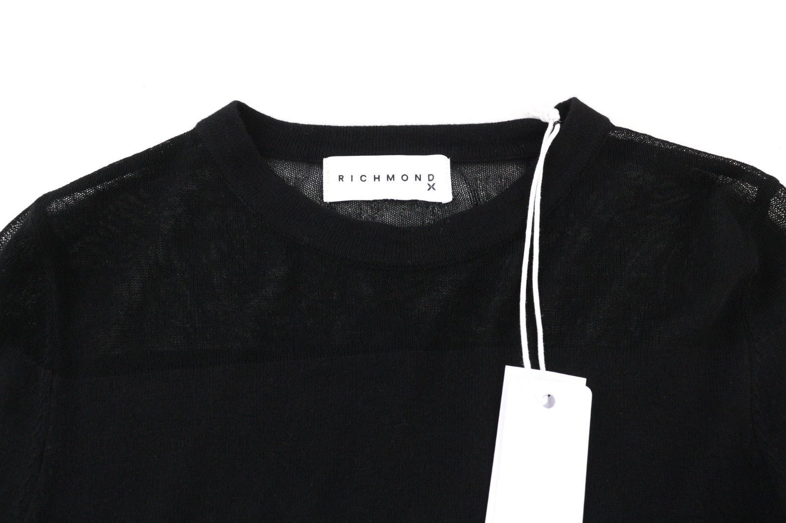 JOHN RICHMOND moteriška suknelė S dydžio, juoda, permatoma, megzta, ilgomis rankovėmis, su logotipu ir šortais
