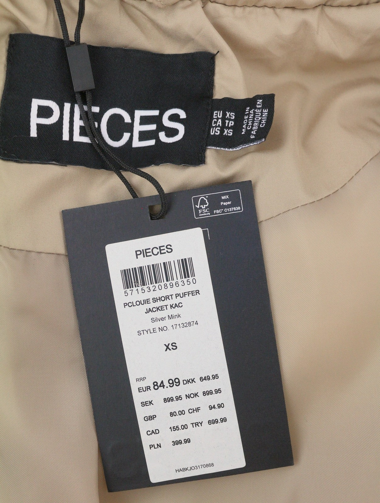 PIECES Louie Short Puffer Women Jacket XS Silver Mink Padded Quilted Hooded Zip