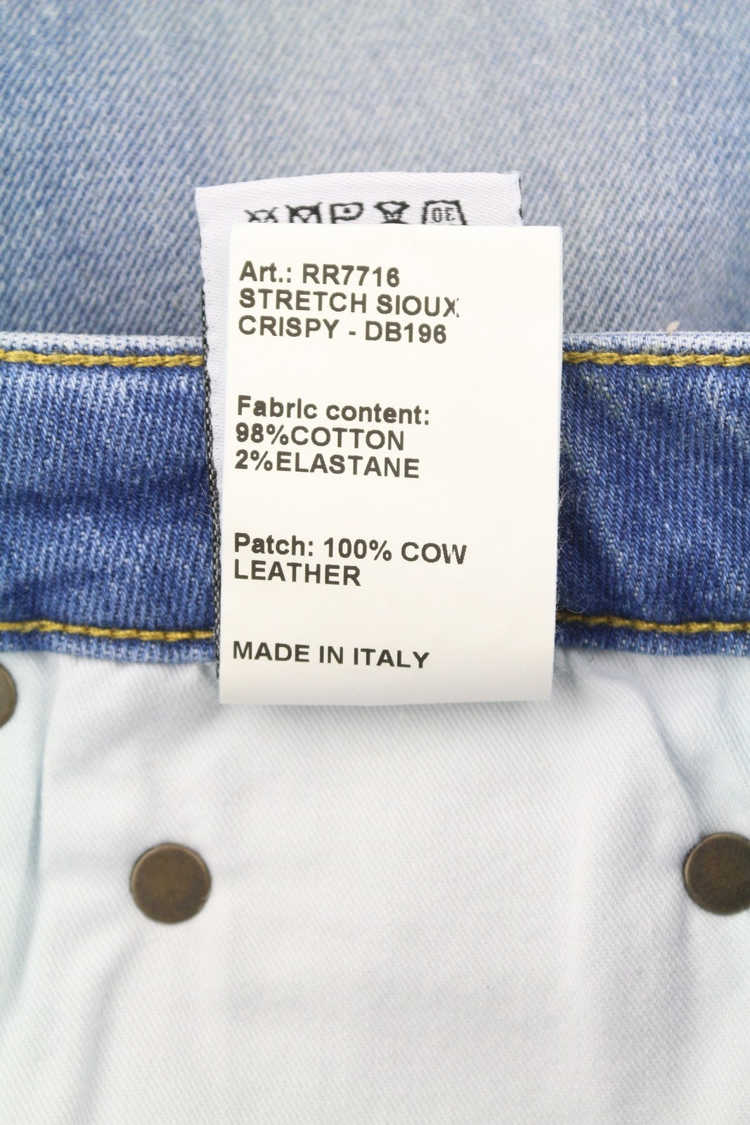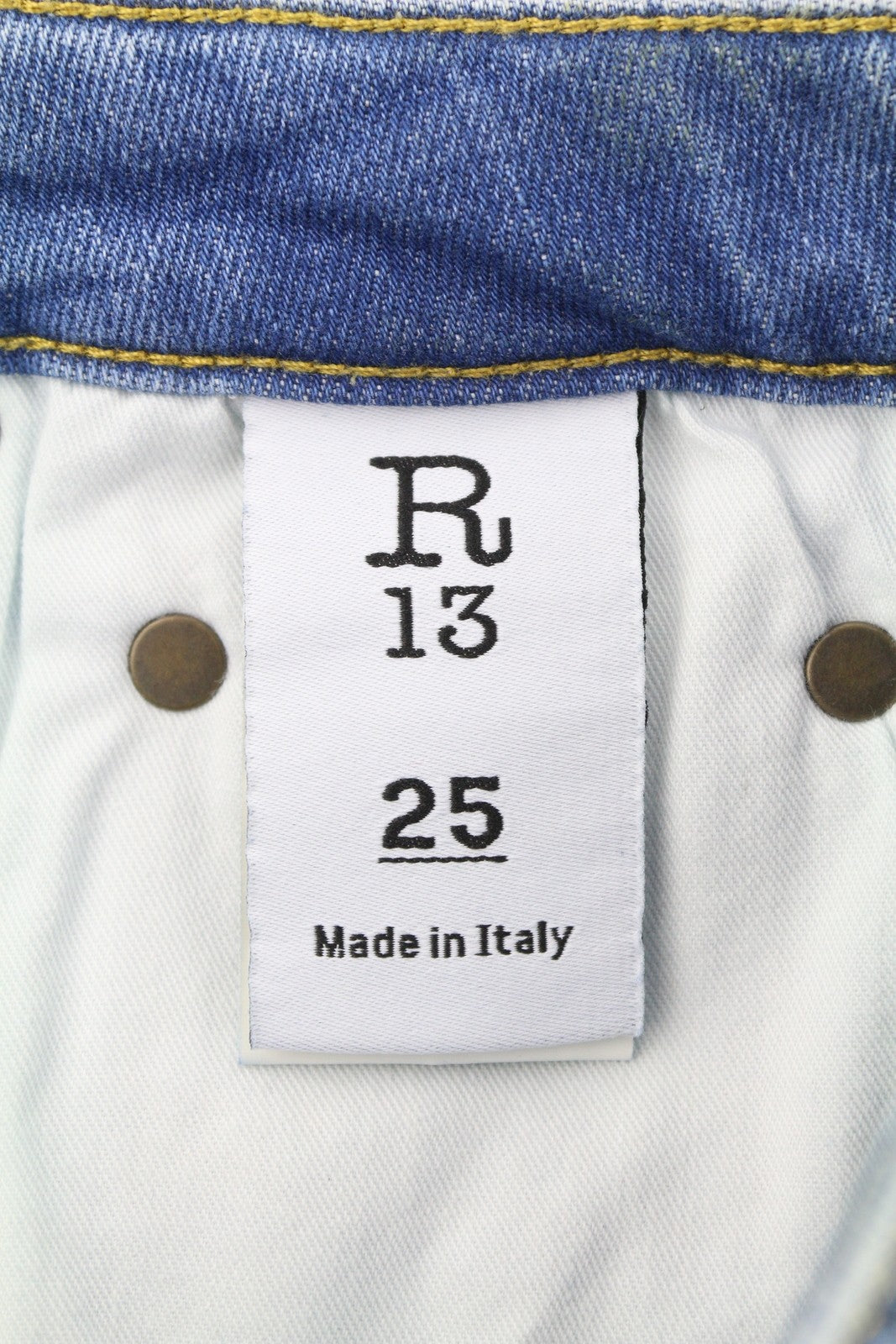 R13 Kick Fit moteriški džinsai 25 Jasper tamprūs platėjantys trumpi, su užtrauktuku ant kulkšnies, išblukintos mėlynos spalvos