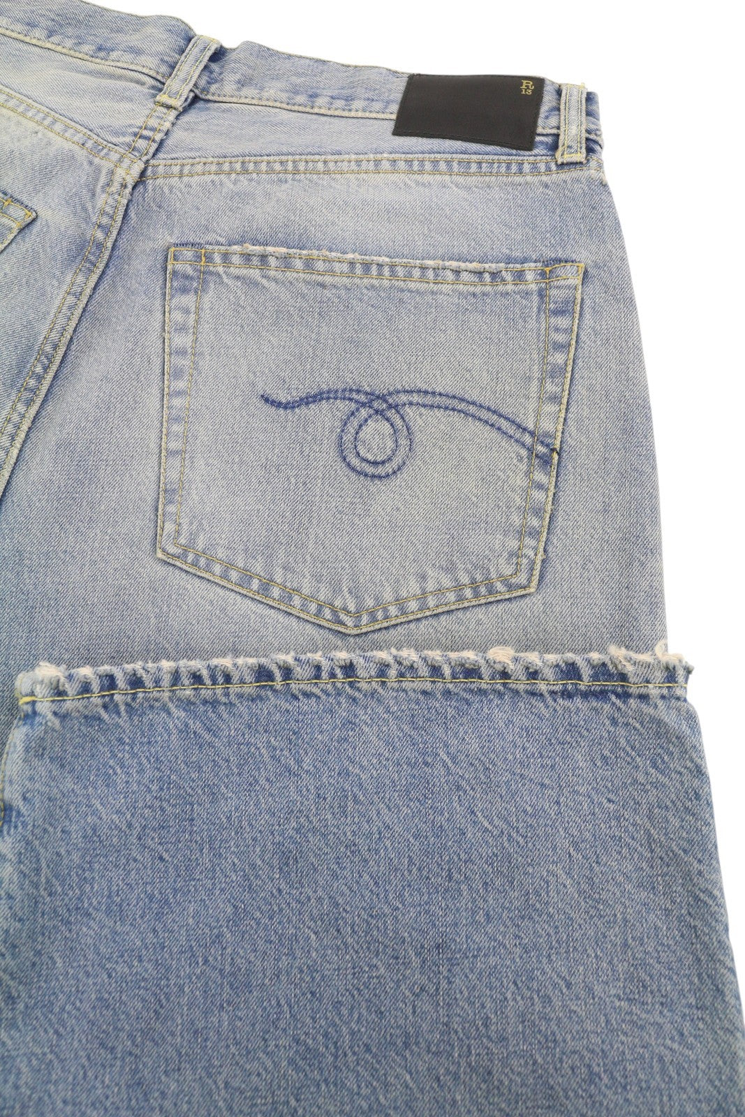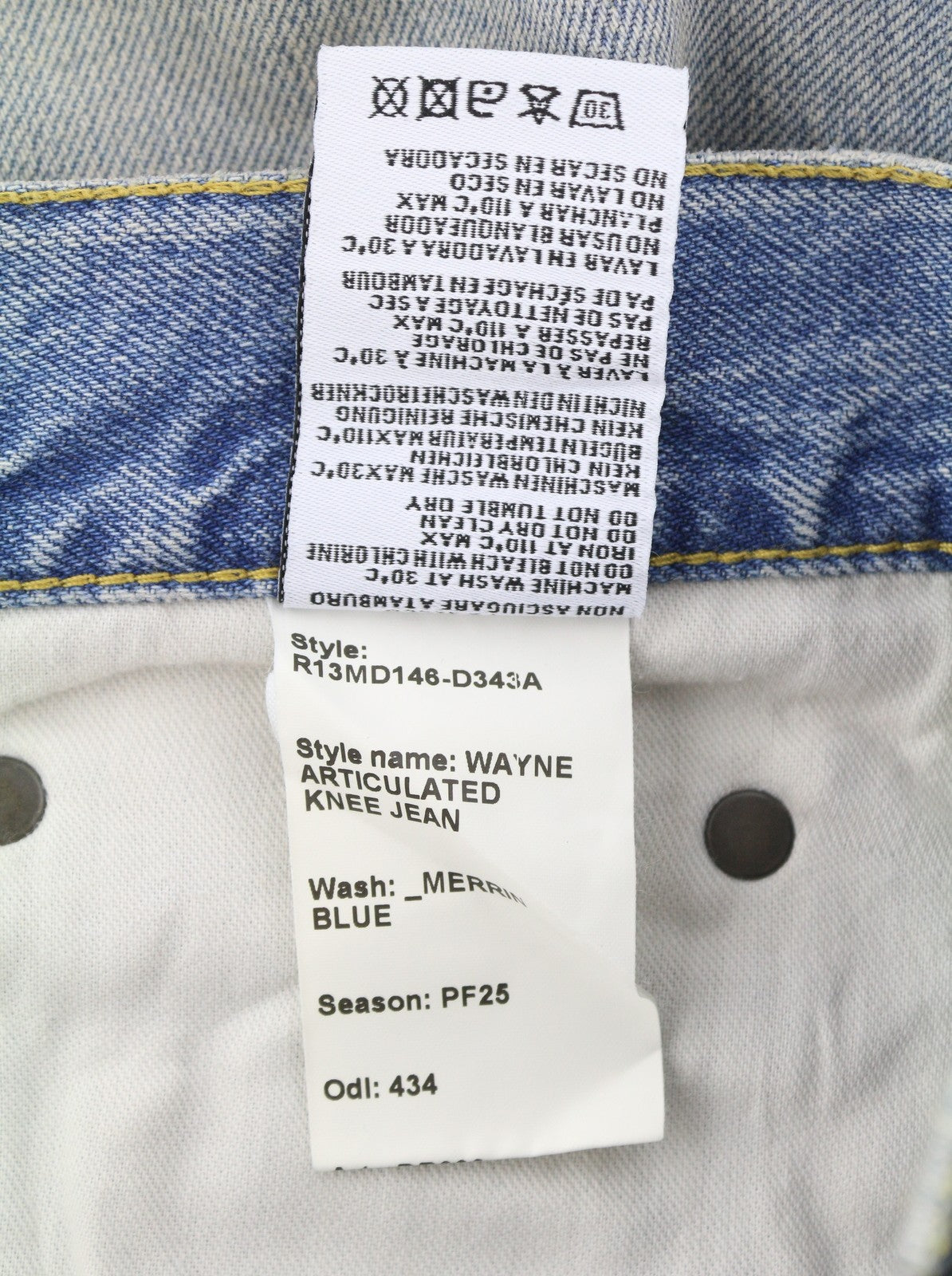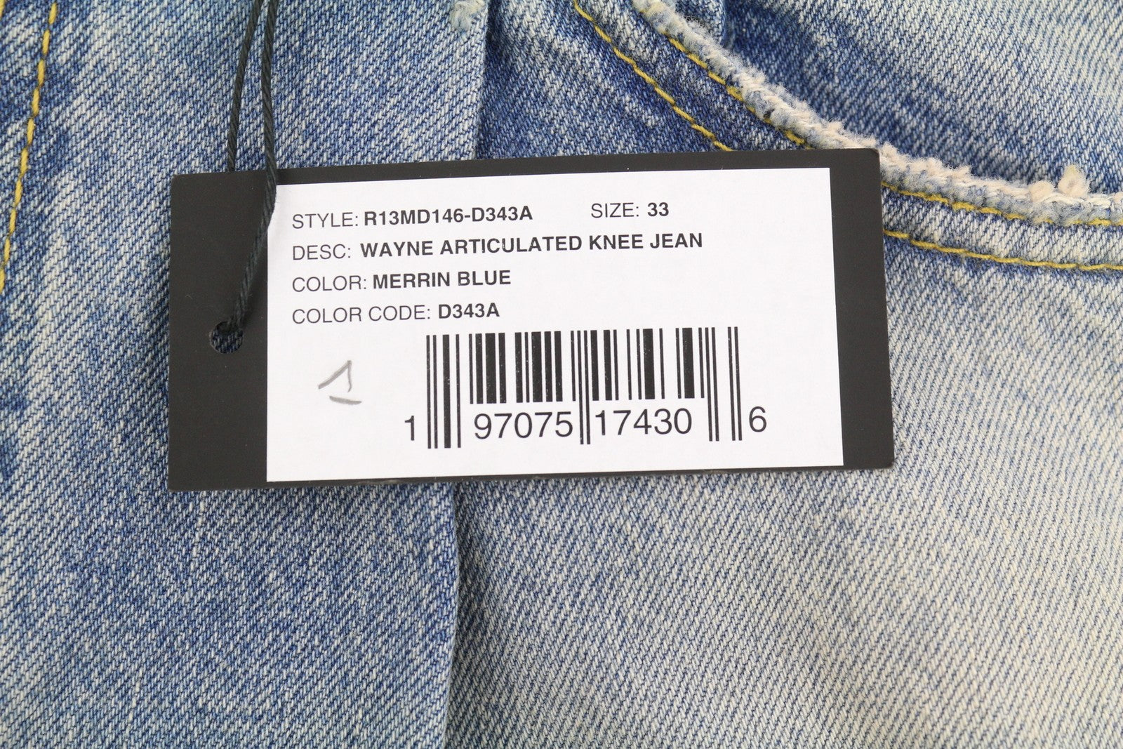 R13 Wayne vyriški džinsai su sąnariais ant kelių, 33 Merrin mėlyni, išblukę ūsai, klostuoti PF25