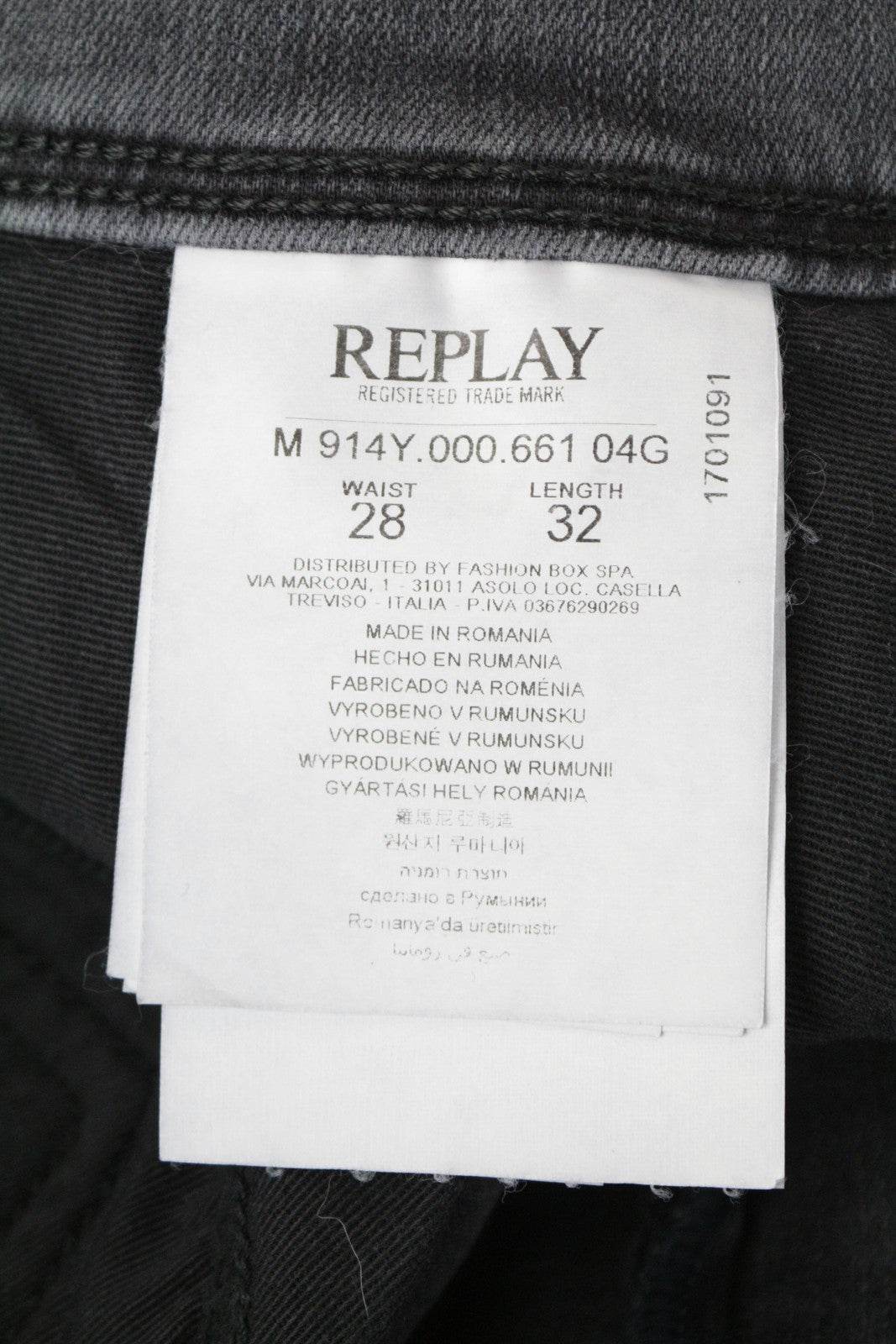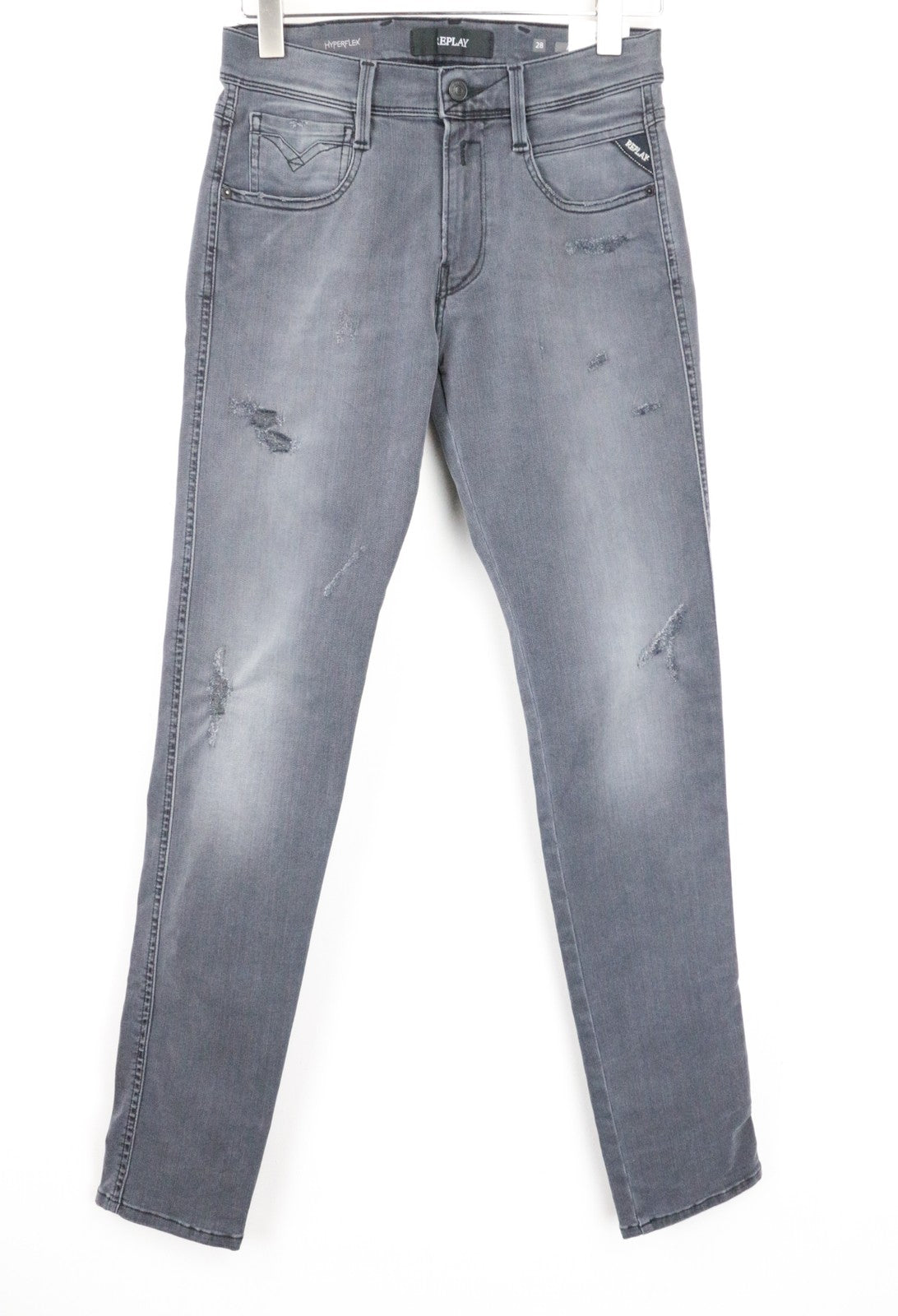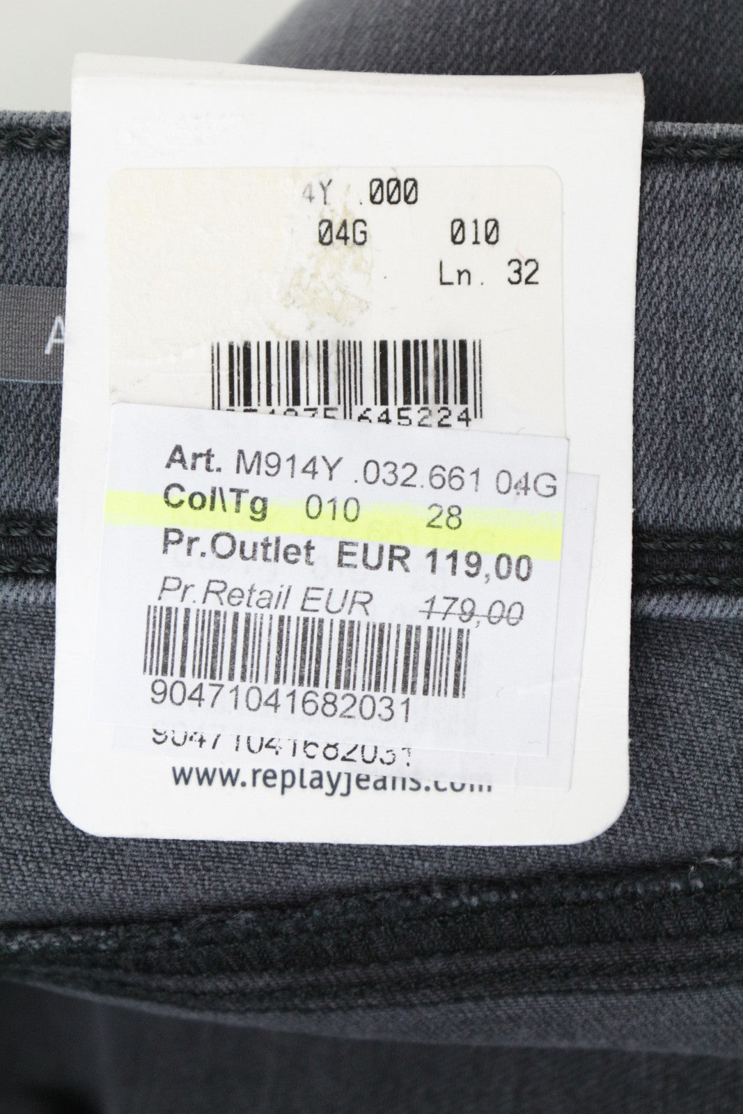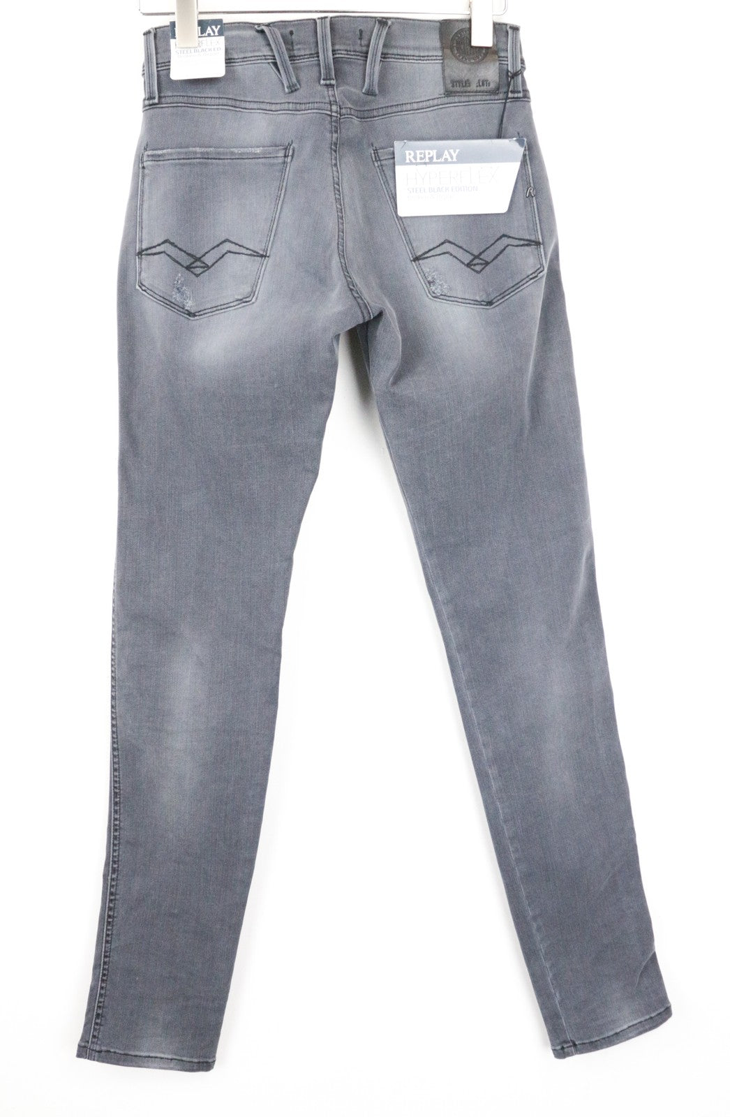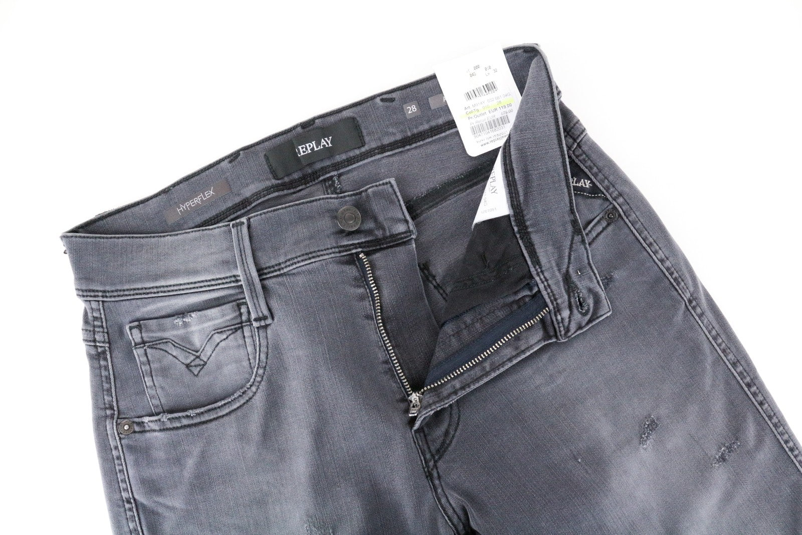 REPLAY Anbass vyriški šviesiai pilki, ploni, tamprūs džinsai su dirbtiniu užtrauktuku, W28/L32