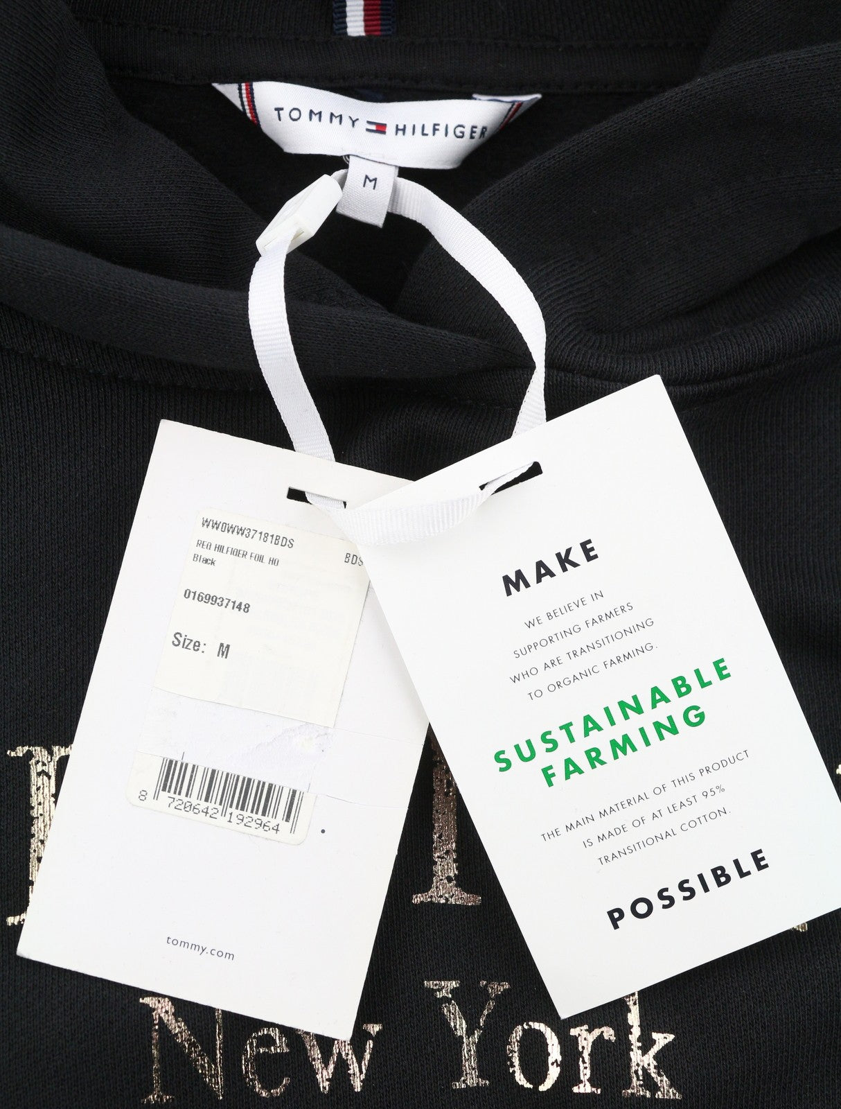 TOMMY HILFIGER moteriškas džemperis su gobtuvu M, juodas priekinis logotipas, didelis laisvo kirpimo megztinis