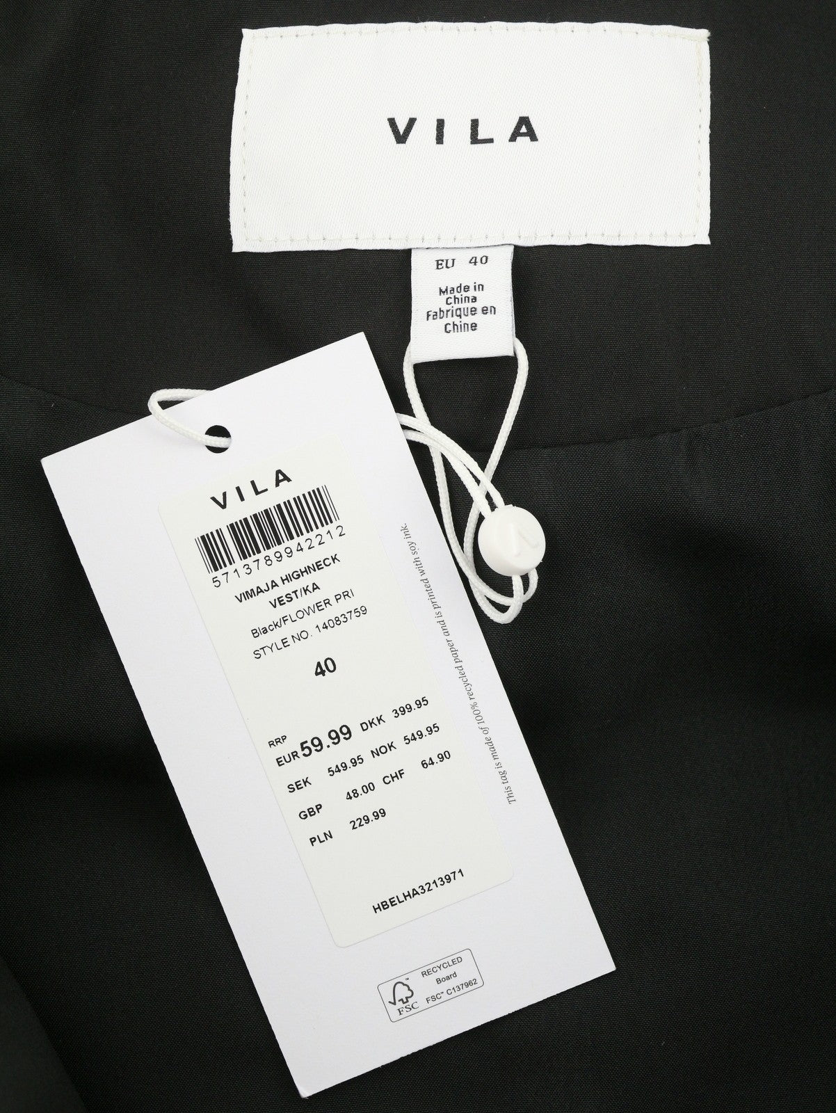 VILA Maja High Neck Women Waistcoat EU40 Black Floral Print Quilted Padded Vest