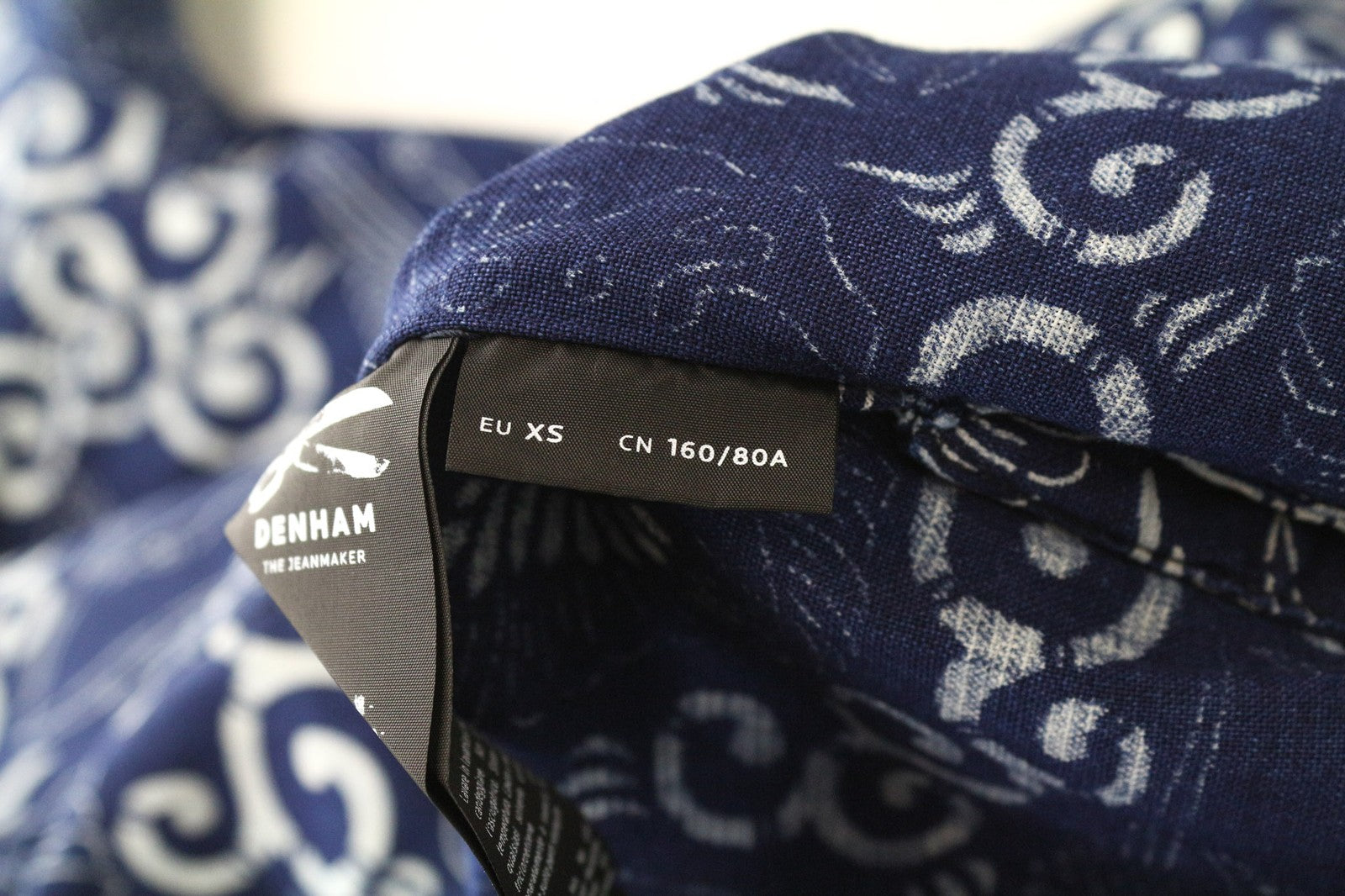 DENHAM Stories Women's Shirt XS Blue Cotton Linen Oriental Print Button-Up