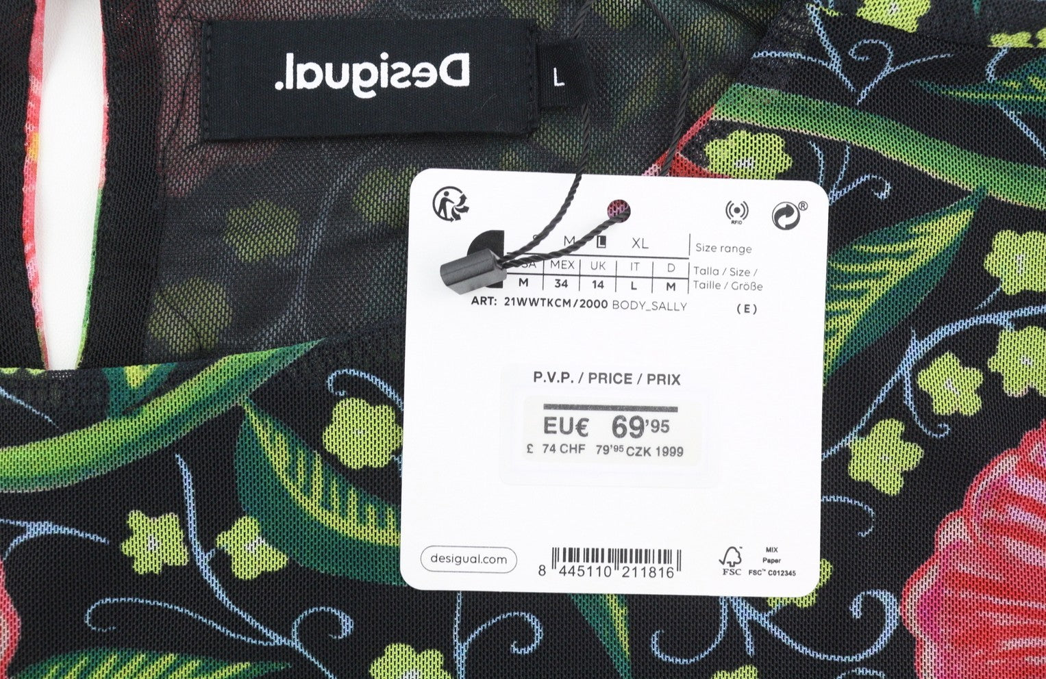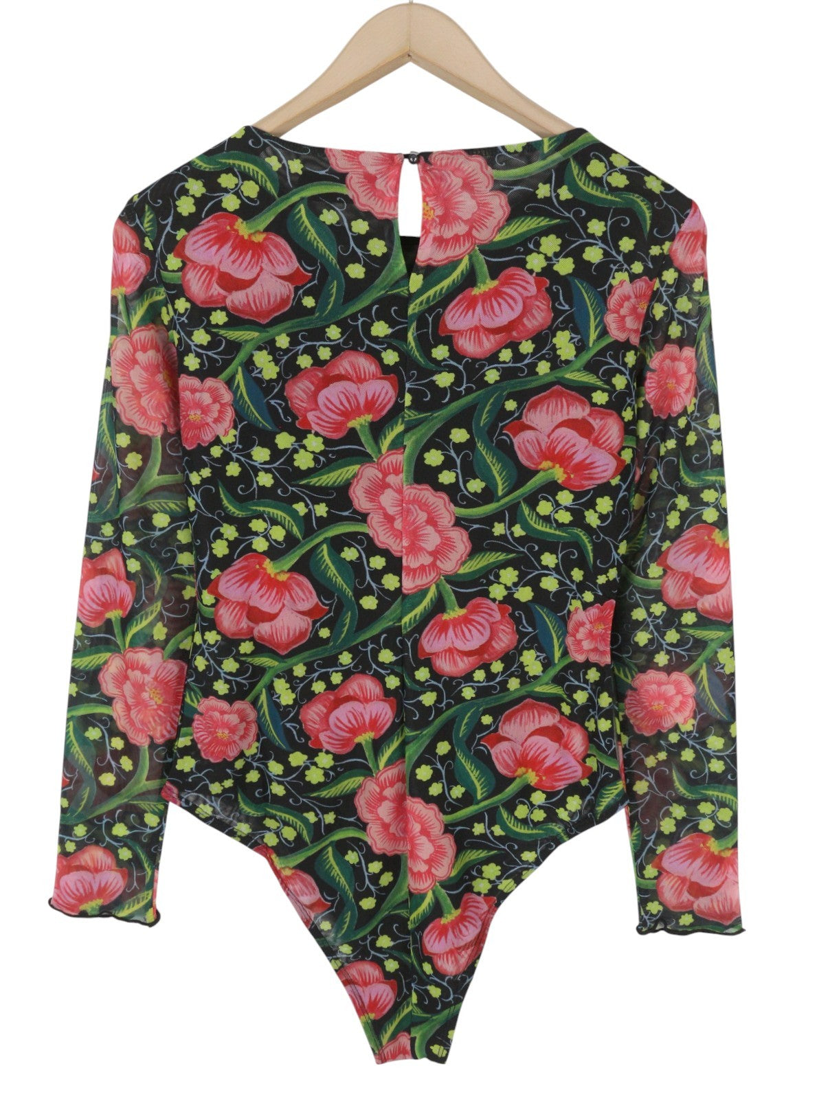 DESIGUAL Sally Women Bodysuit L Long Sleeve Flower Print Slim Fit Mesh