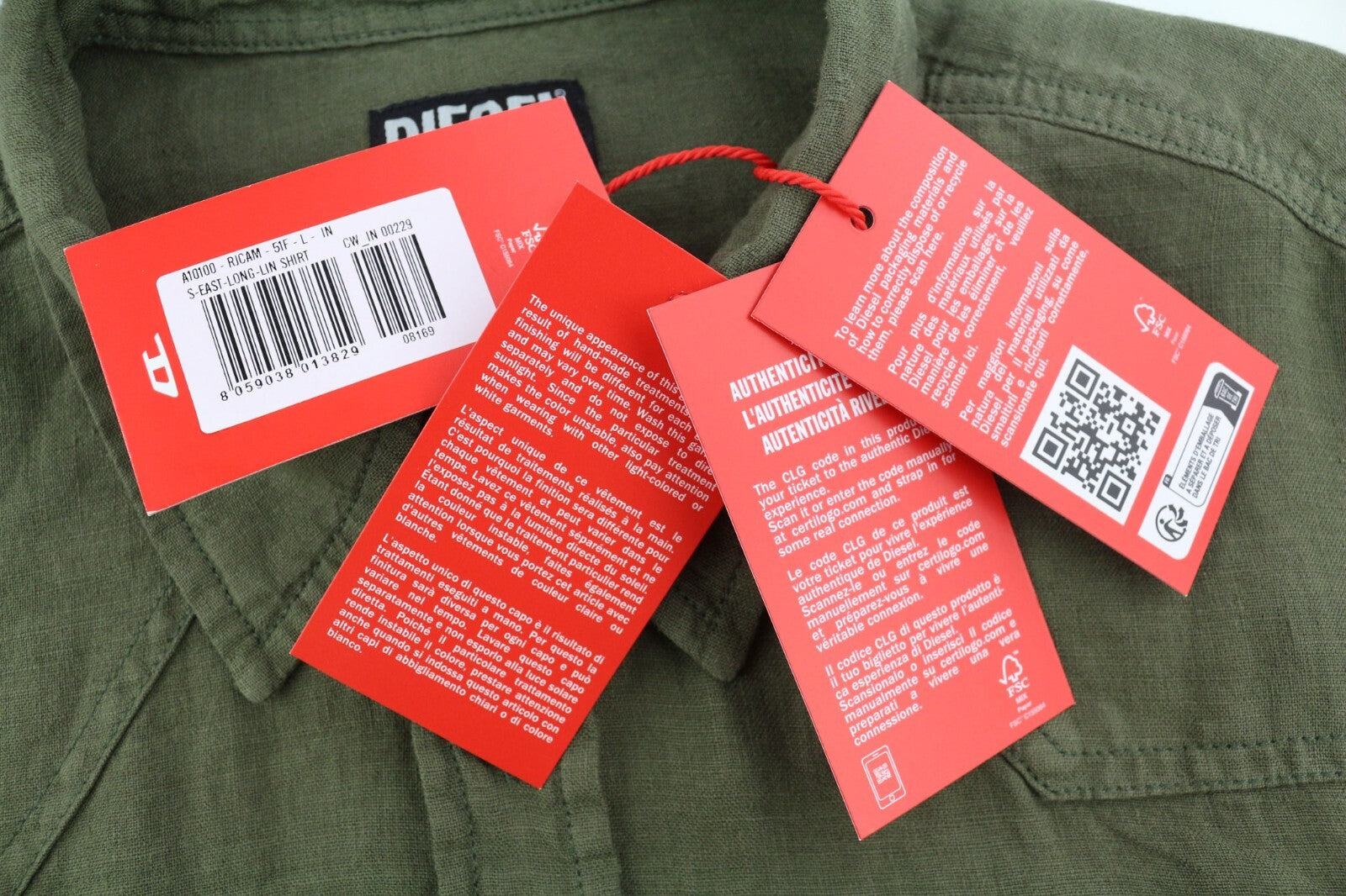 DIESEL S-East-Long-Lin Mens Shirt L Olive Green Linen Spread Neck RRP€175