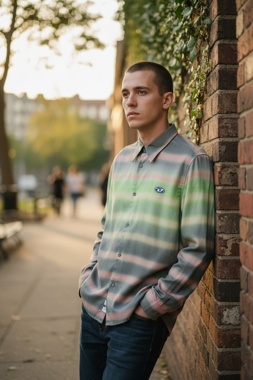 DIESEL S-Tucker-Stripe Men Shirt L RRP€150 Pattern Button Up Spread Logo Light