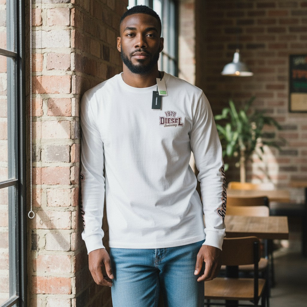 DIESEL T-Diegos-LS-K27 Men T-Shirt 2XL White Cotton Long Sleeved Crew Neck