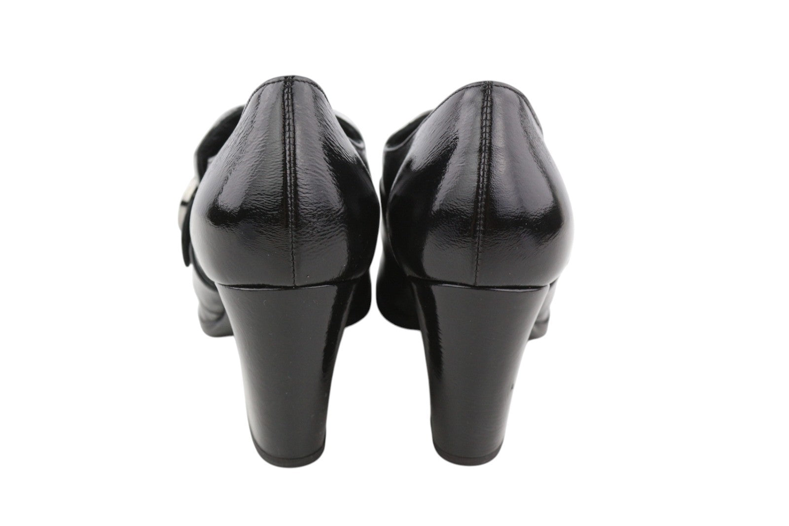 EMPORIO ARMANI Women Heels EU37 Black Patent Leather Square Toe Buckle Detail