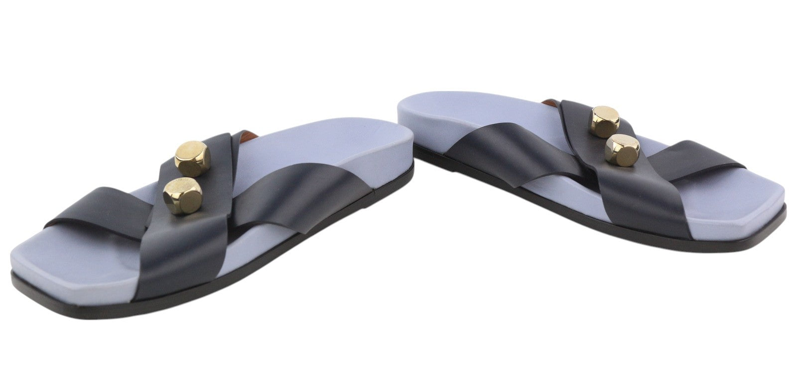 EMPORIO ARMANI Women's Black Leather Flats EU37 Open Toe Slip-On Metal Detail