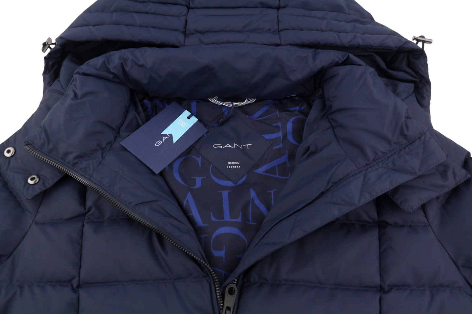 GANT Classic Down Long Women Jacket M Evening Blue Quilted Hooded Mid-Length