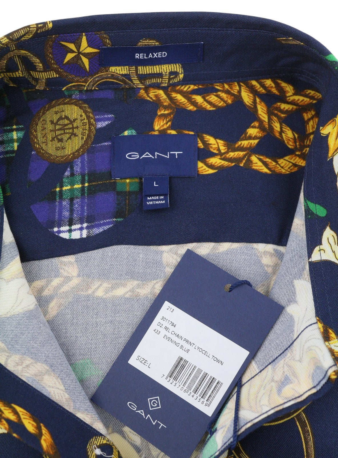 GANT Rel Chain Print Lyocell Town Men Shirt L Evening Blue Relaxed Button-Up