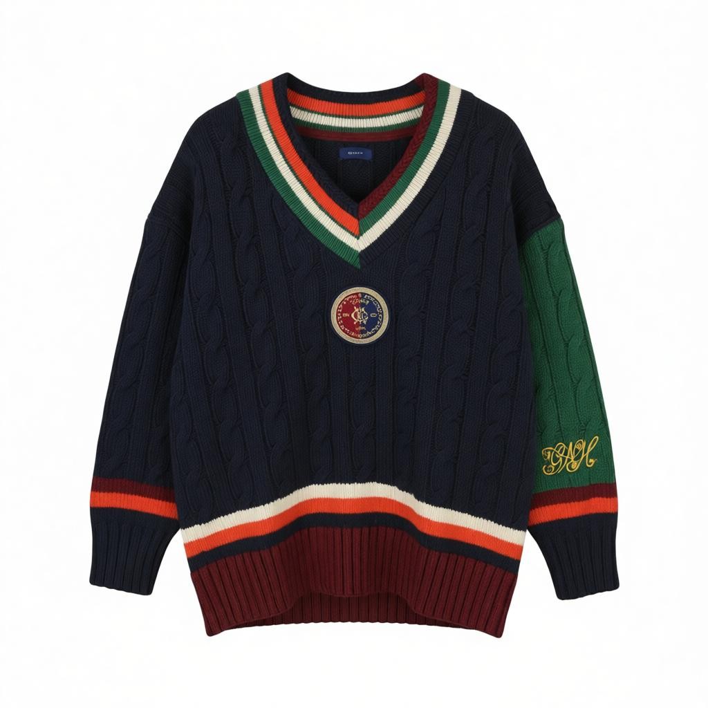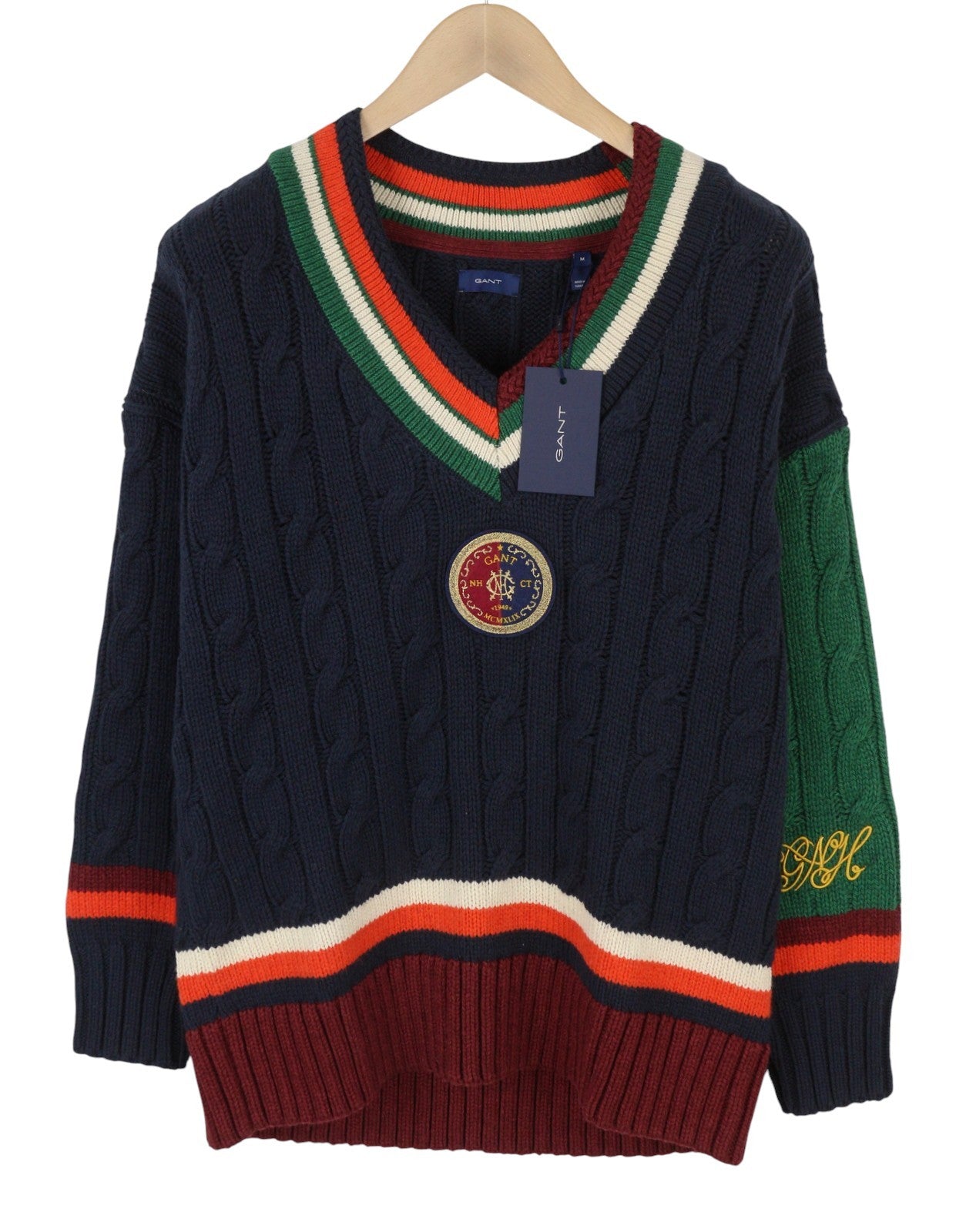 GANT Varsity V-Neck Women Jumper M Evening Blue Wool Blend Knit Pullover