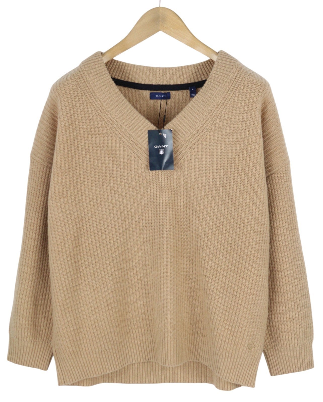 GANT Wool Rib V-Neck Women Jumper L Beige Knitted Oversized Loose Fit Pullover
