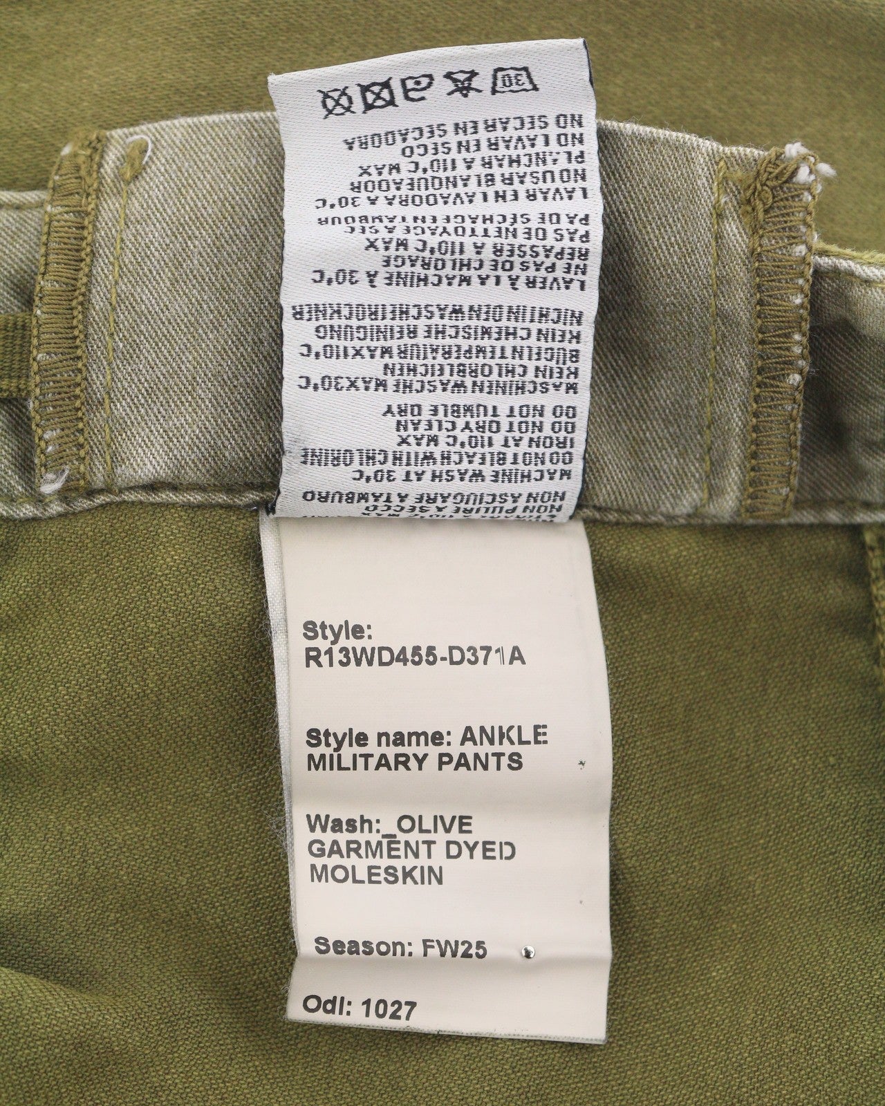 R13 Ankle Military Women Trousers 27 Olive Garment Dyed Moleskin FW25 RRP1199