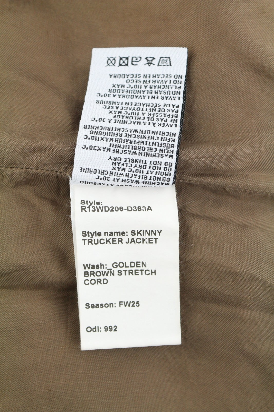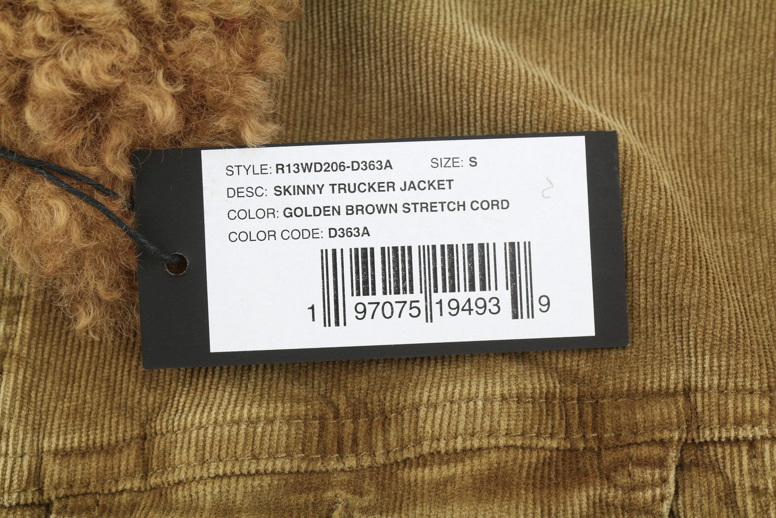 R13 Skinny Trucker Women Jacket S Golden Brown Stretch Cord Button FW25 RRP1199