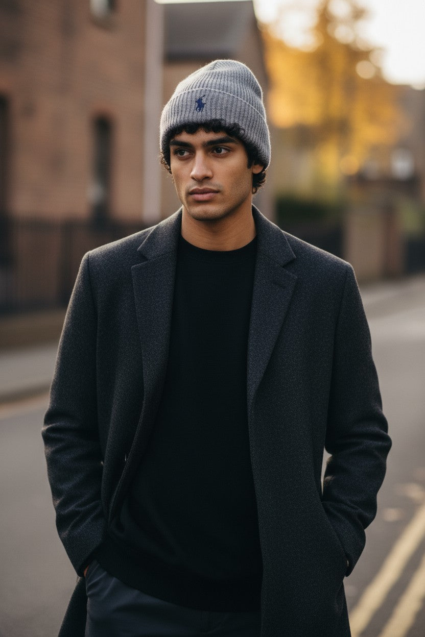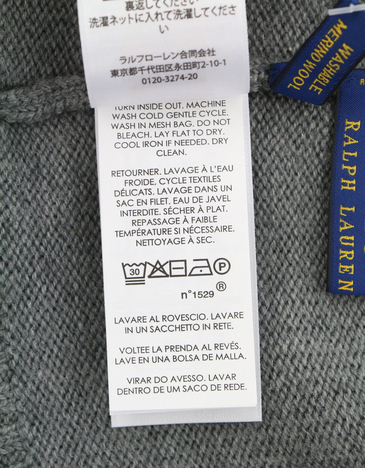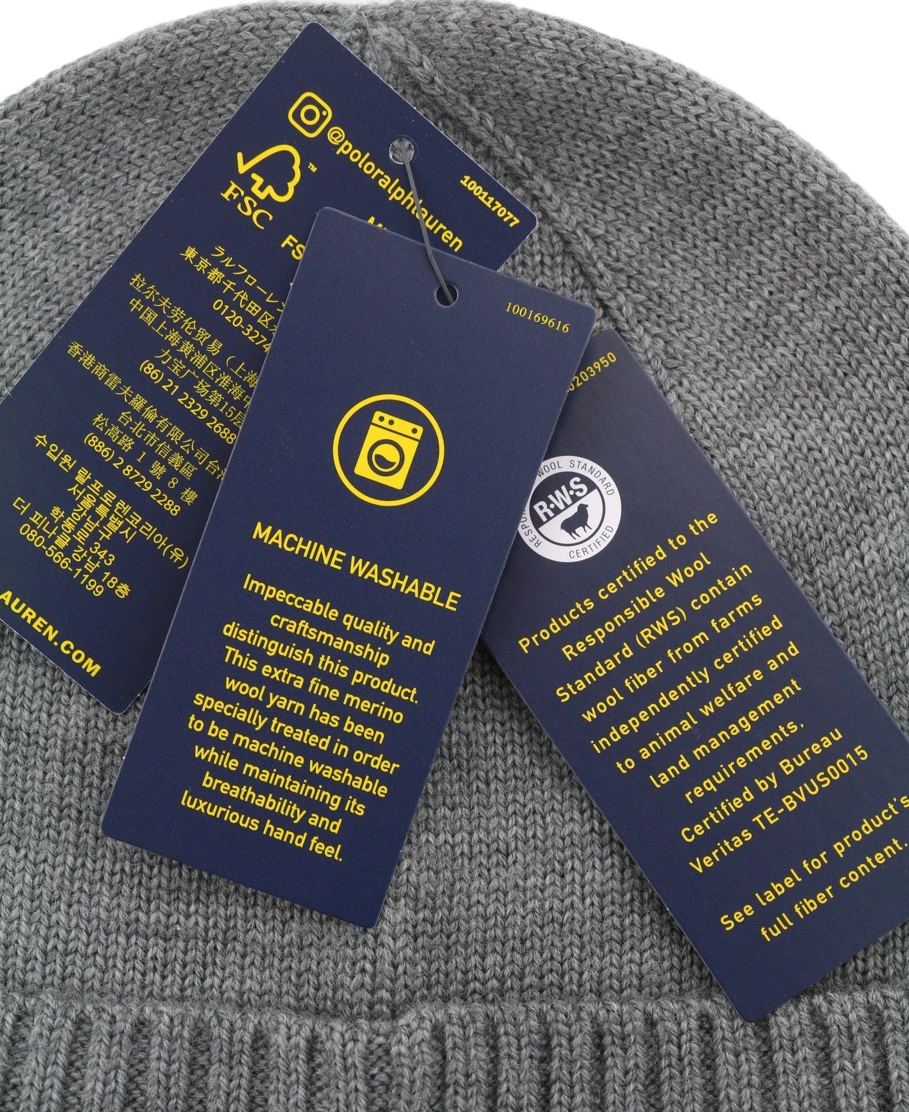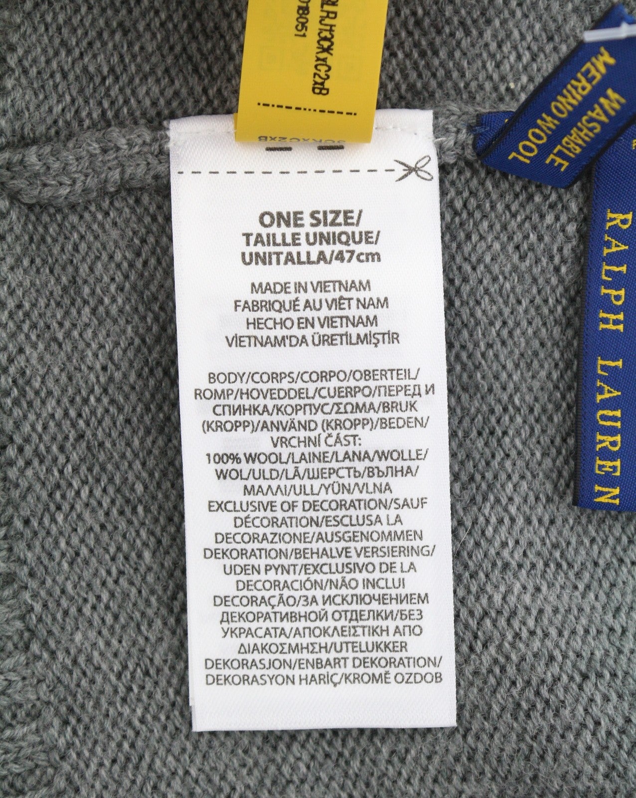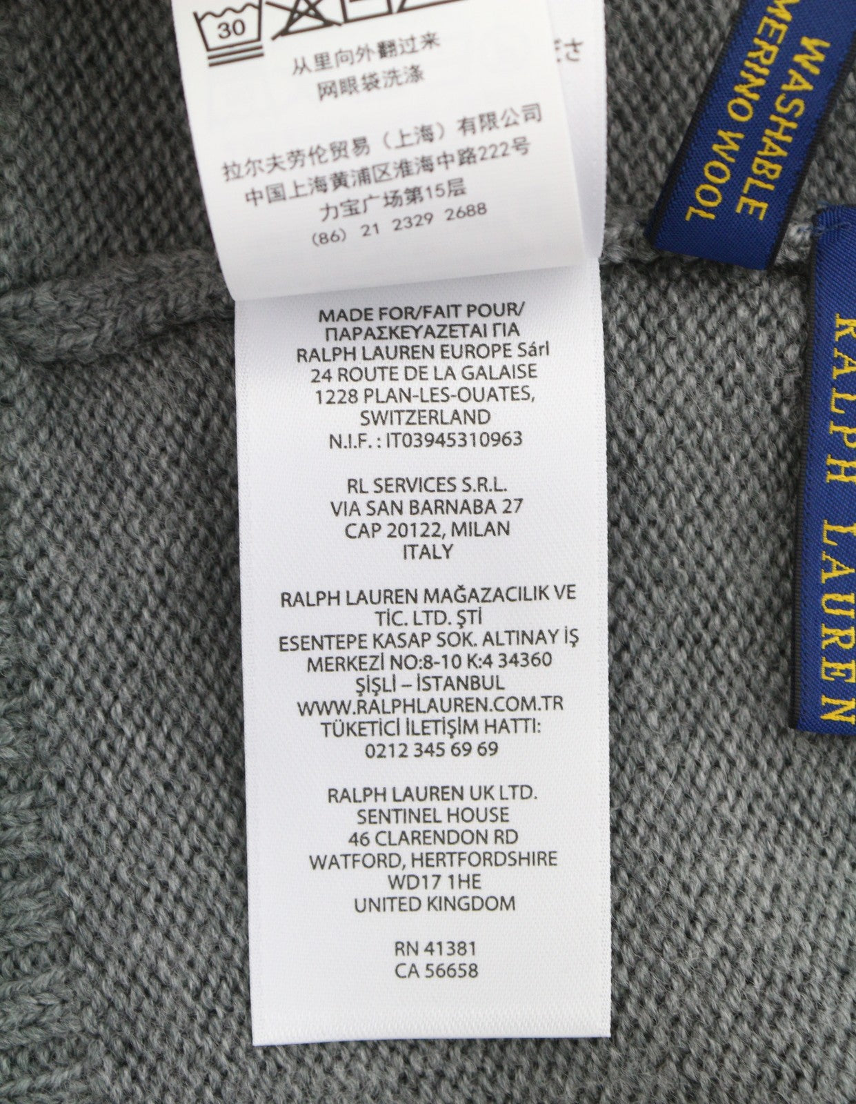 RALPH LAUREN Men Hat 47 CM Grey Melange Embroidered Washable Merino Wool Beanie