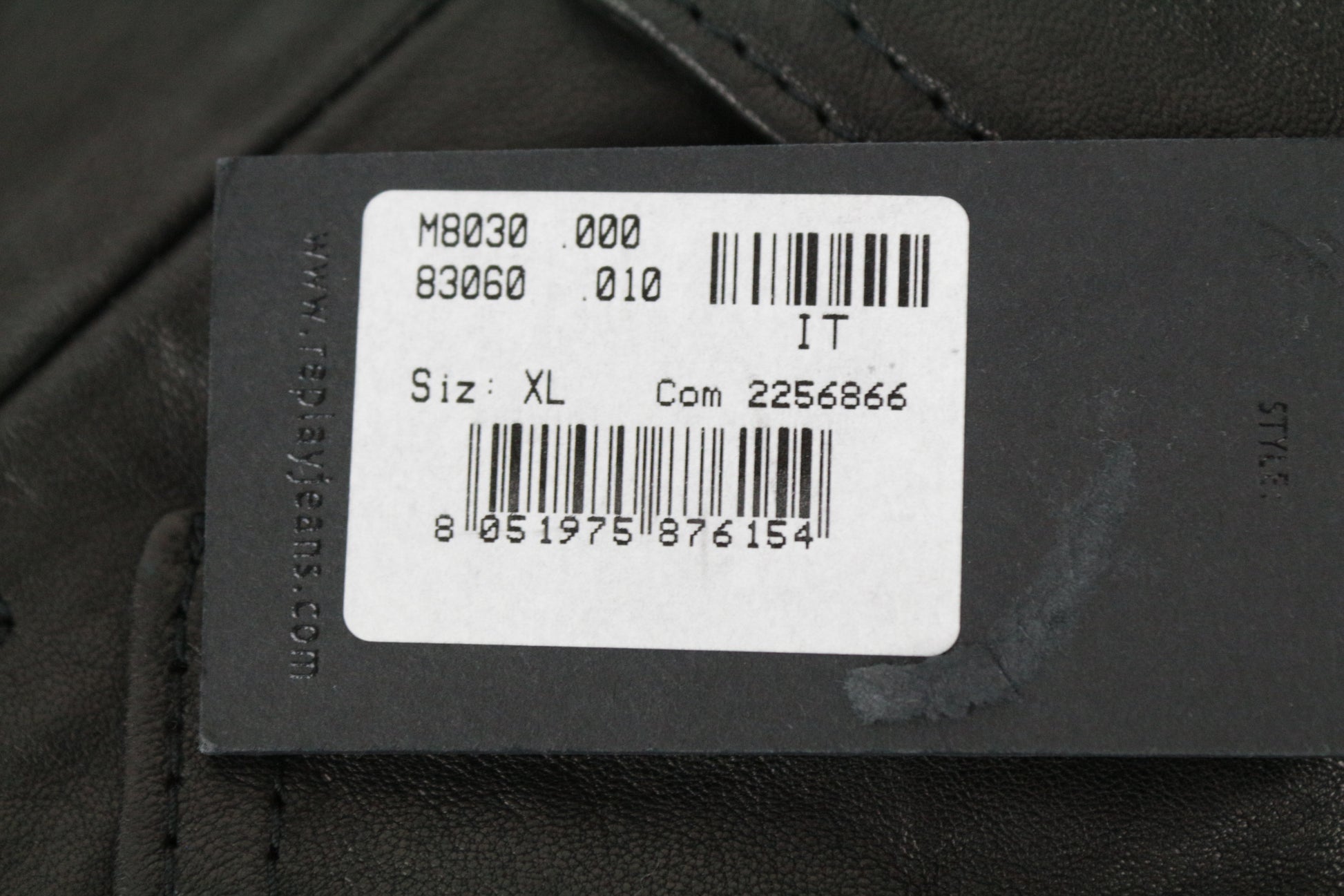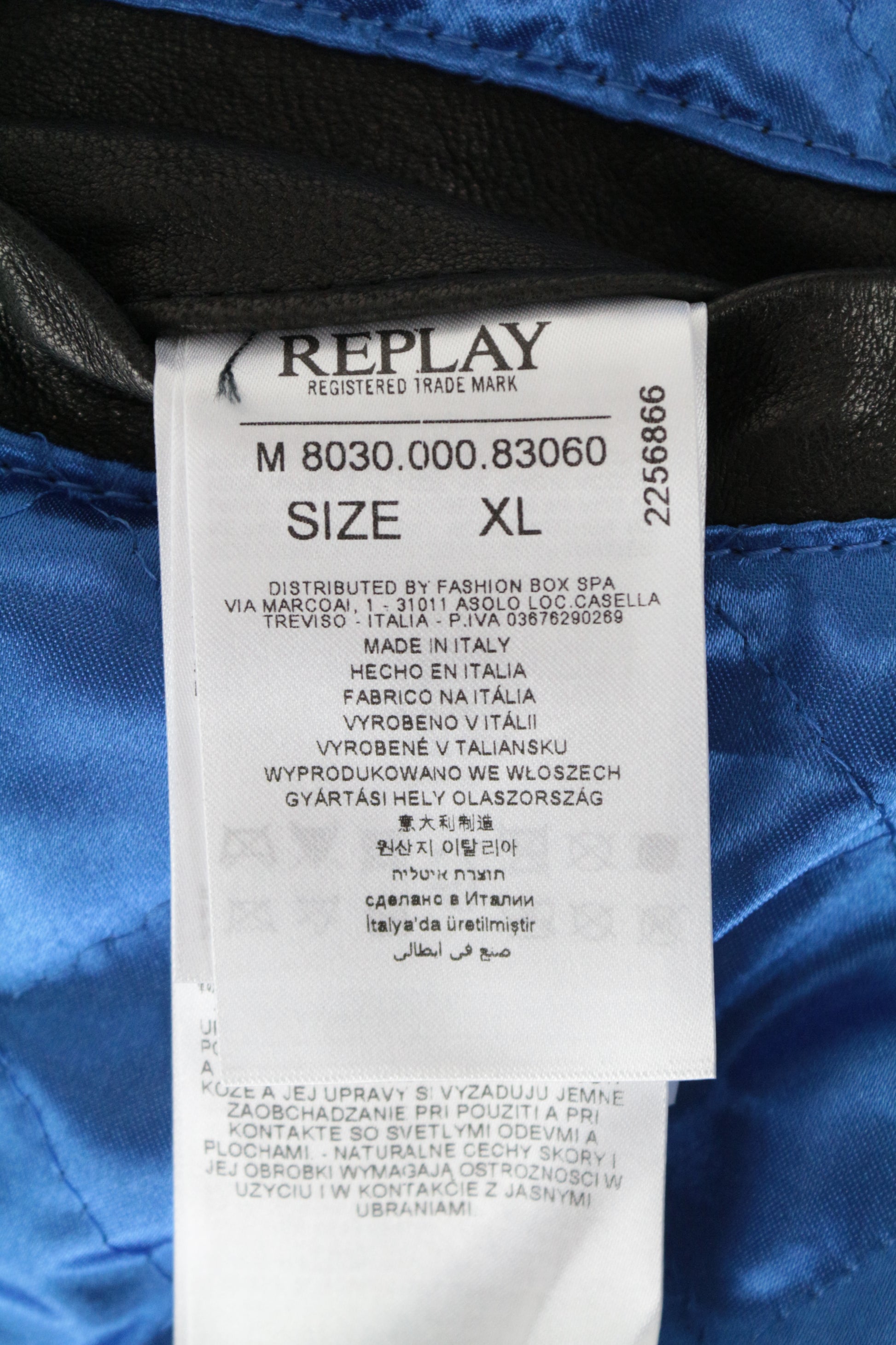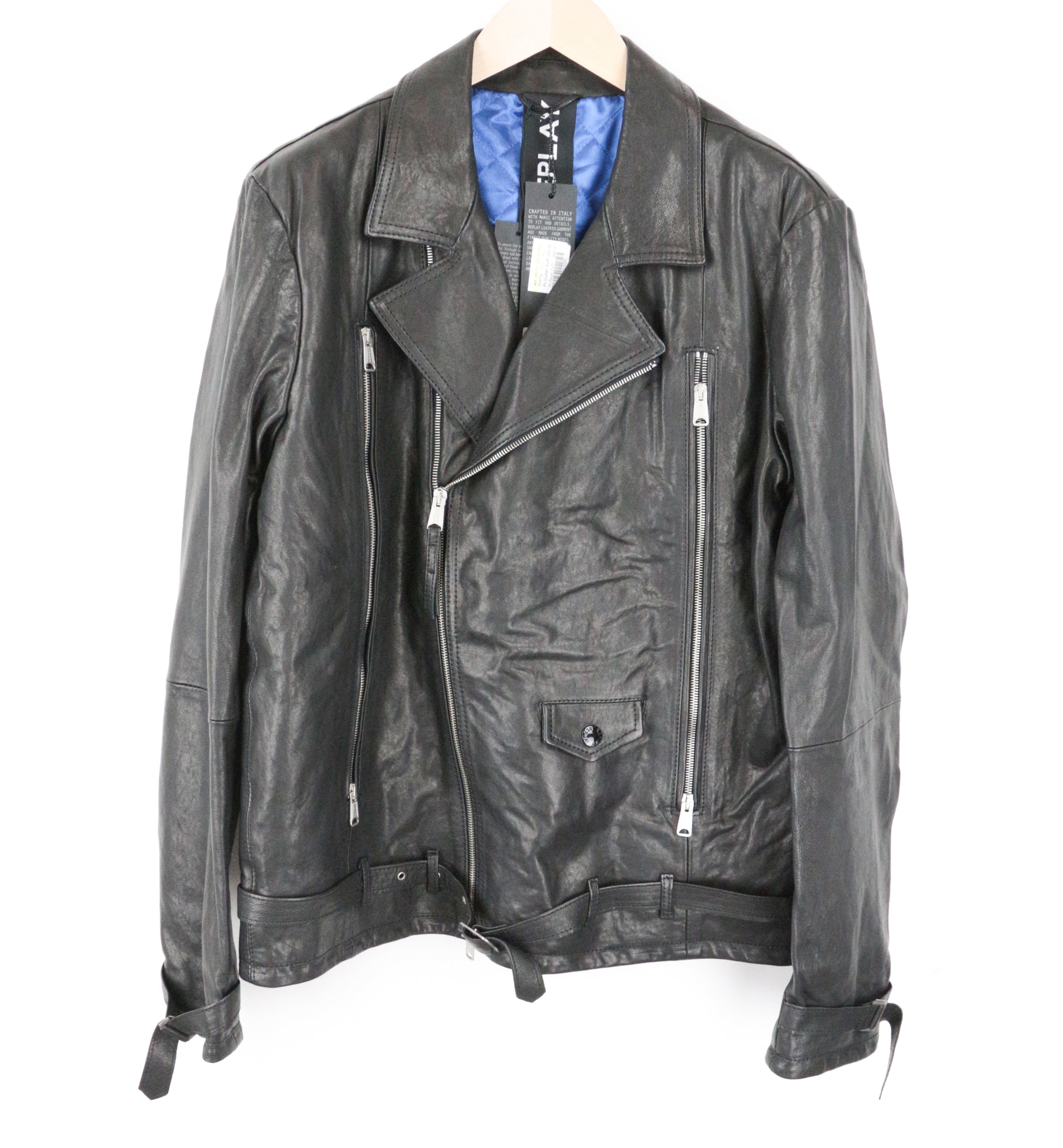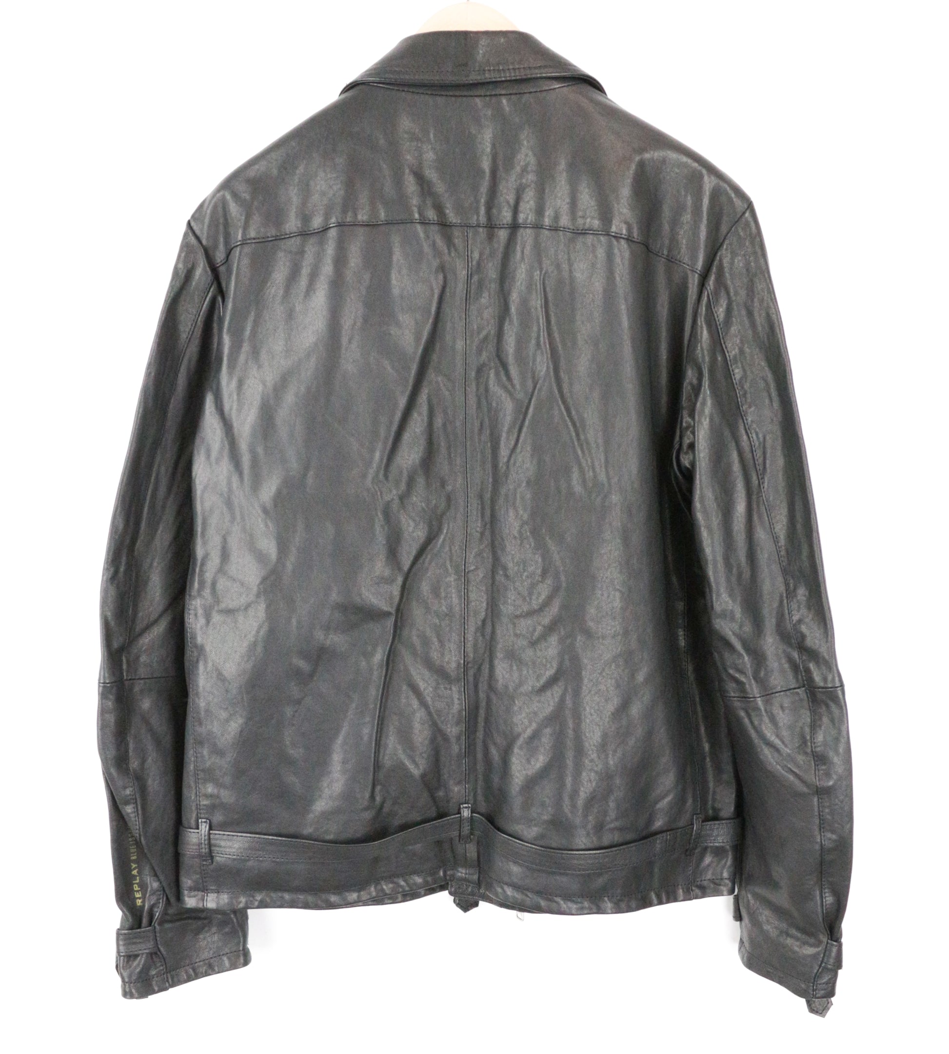 REPLAY Men's XL Black Lambskin Biker Jacket Belted Collared Pocketed Lined