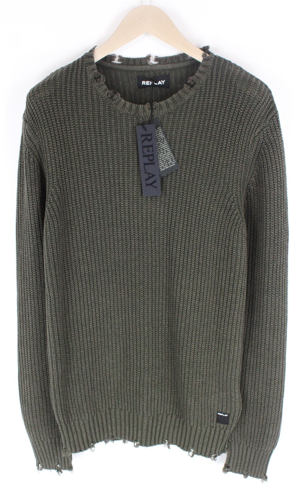 REPLAY Mens XL Green Jumper Ripped Cotton Knitted Long Sleeve Sweater Casual