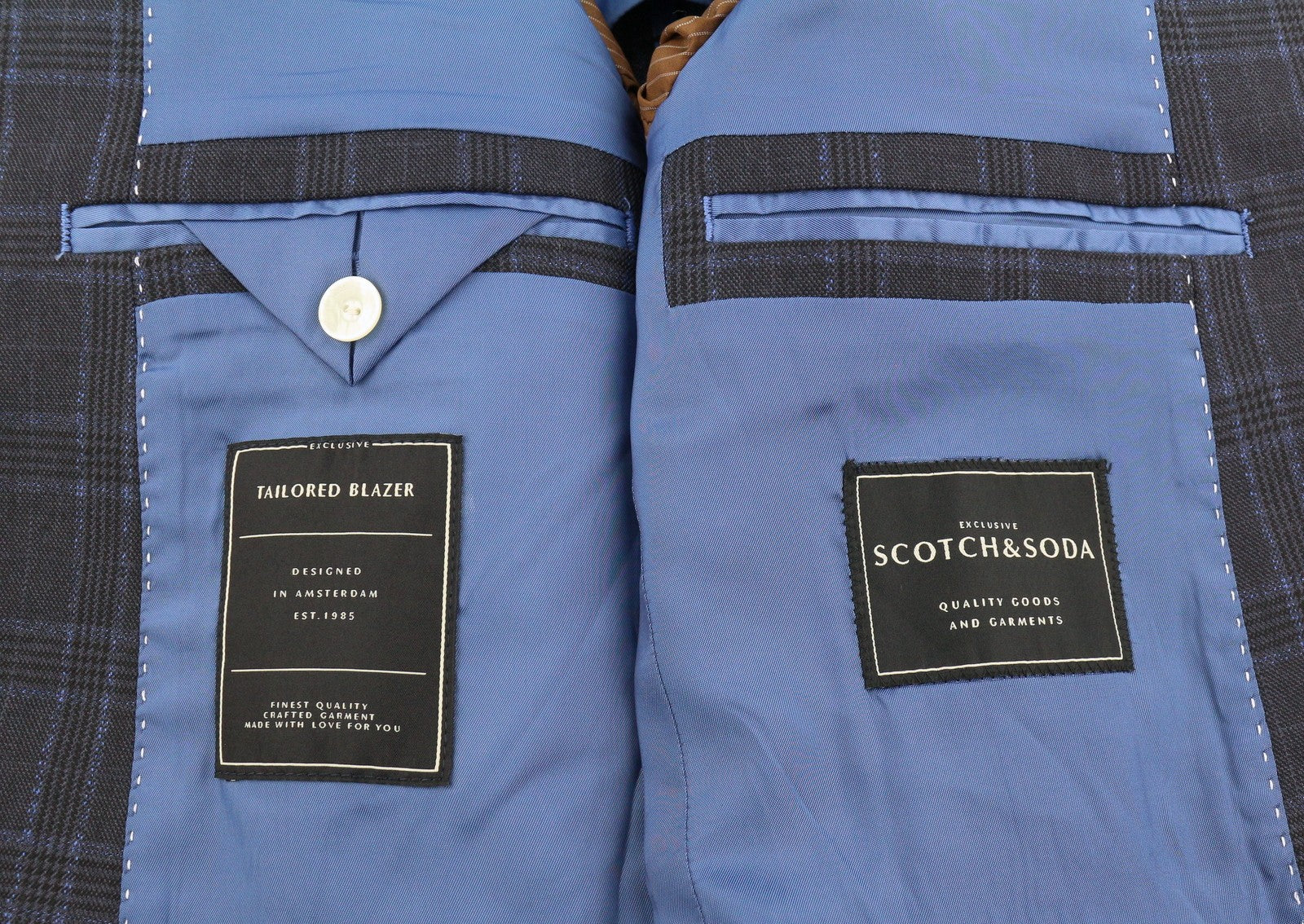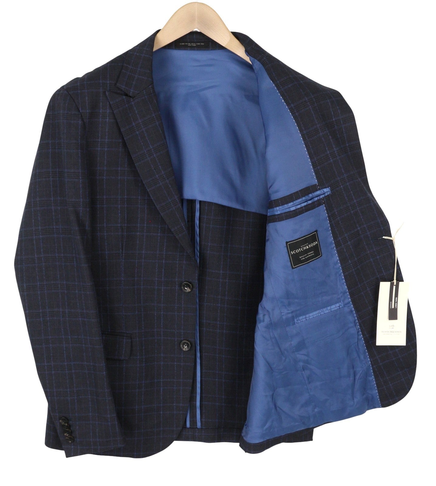 SCOTCH & SODA Men Blazer M Navy Blue Check Wool Blend Peak Lapel Single-Breasted