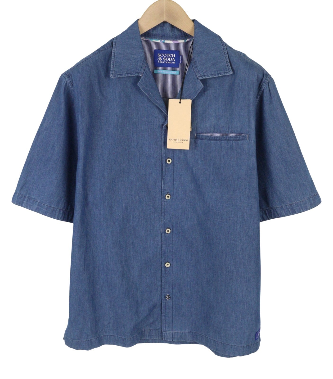 SCOTCH & SODA Men Shirt L Blue Denim Look Relaxed Fit Short Sleeve