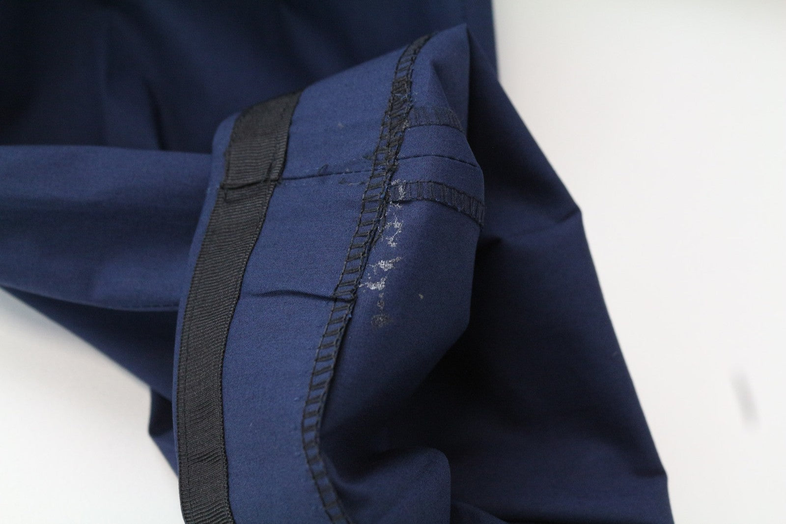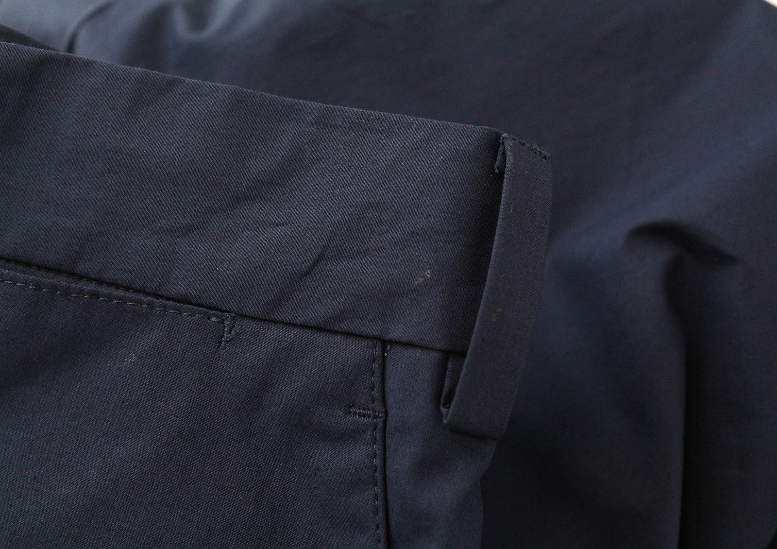 Used. Tailored trousers' length, waistline width, and around the crotch area. Pressure marks on the front and back. Stained inside the right hem. Please see added photos.