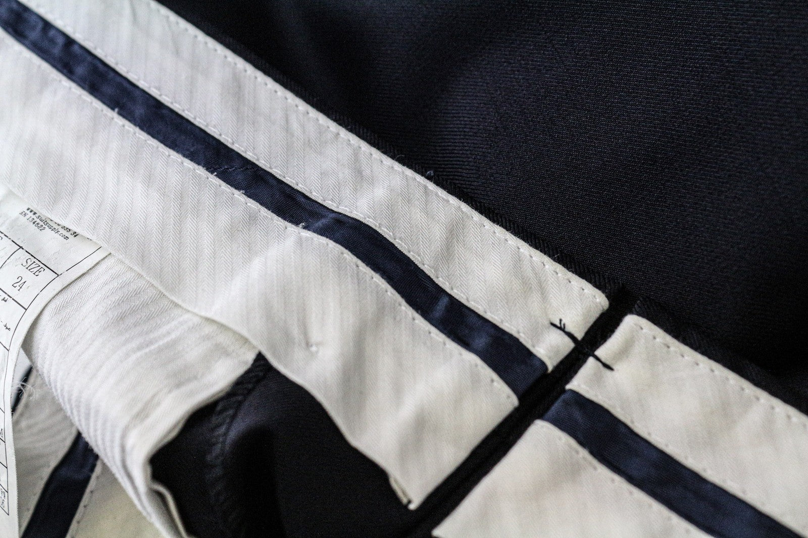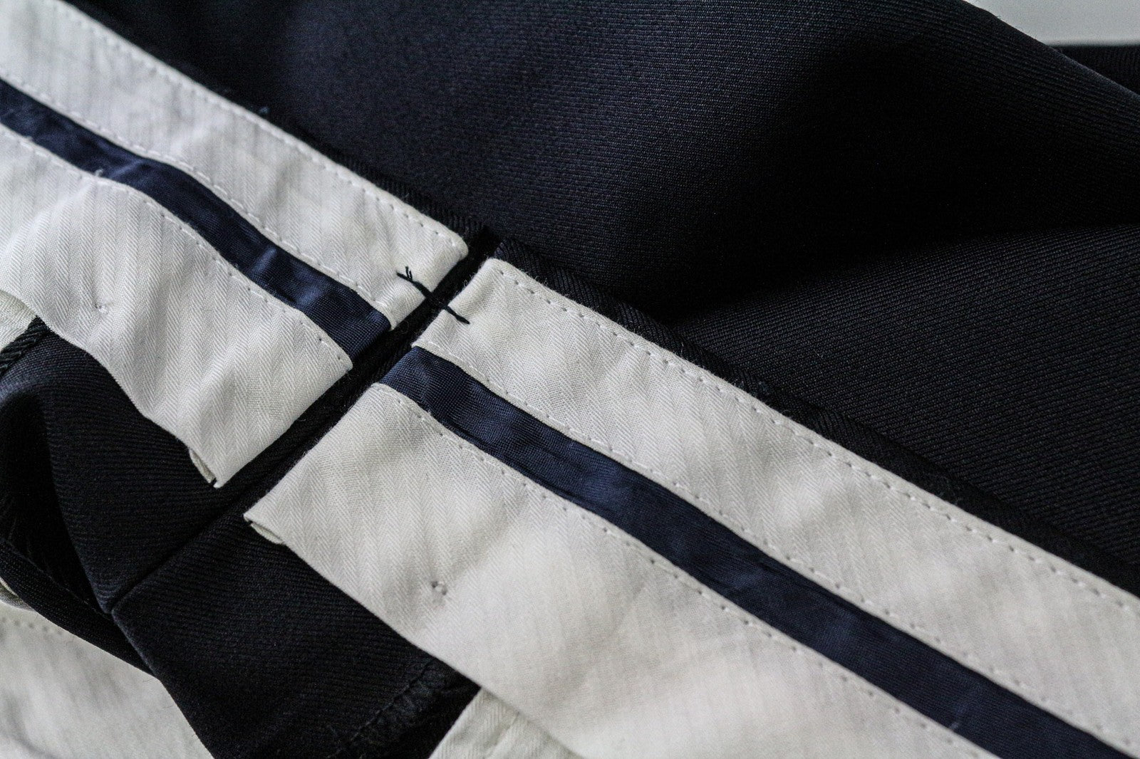 Stained trousers lining, pulled threads at the back. Pulled threads on the waistcoat's belt and a stain on the back. Please see added photos.