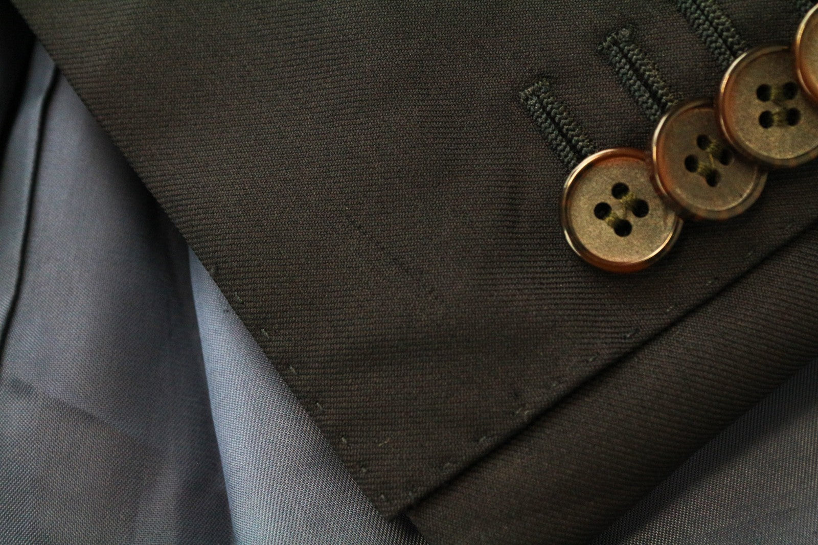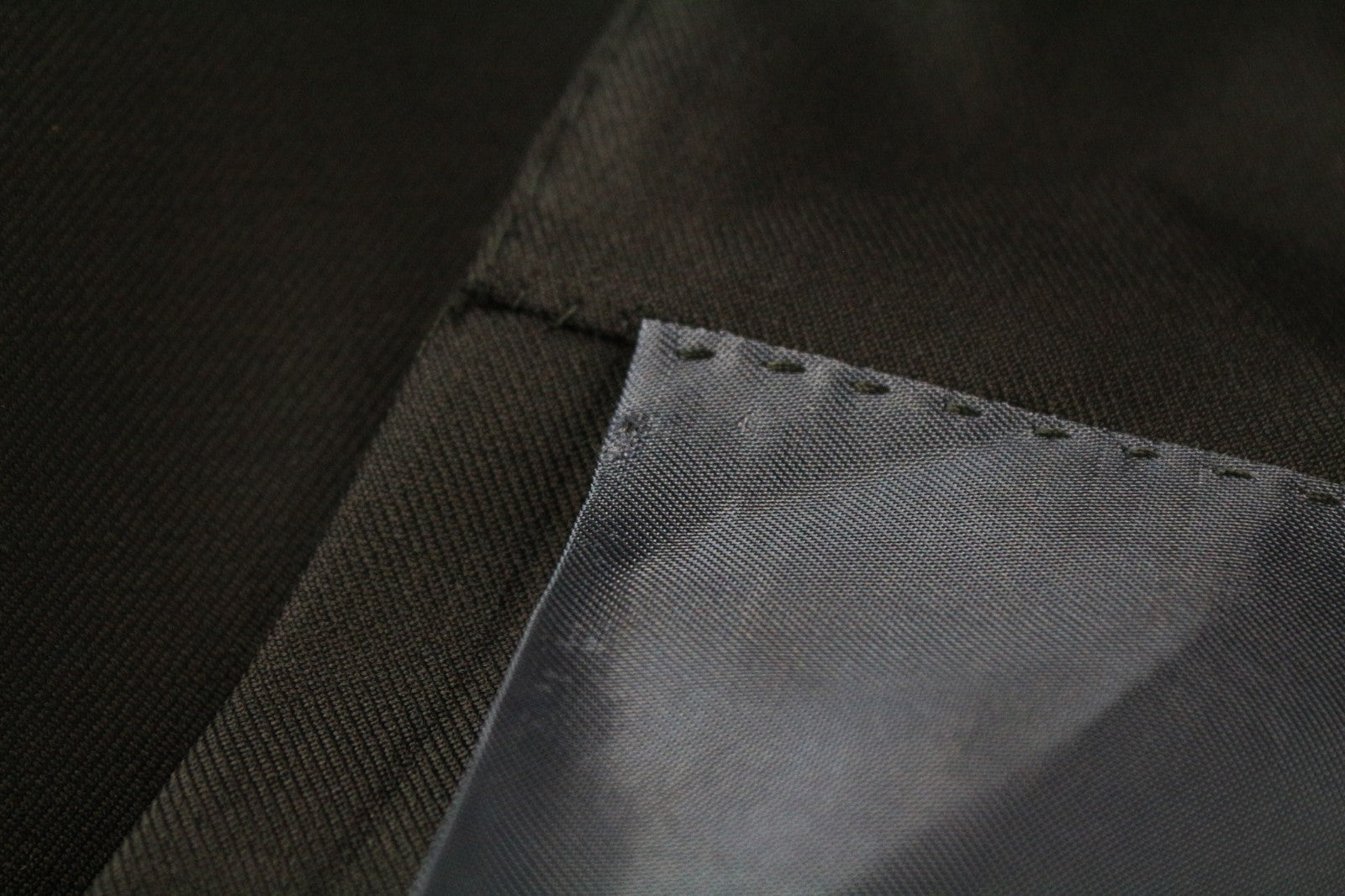 Used. Pulled threads on left leg and on the blazer's back. Tear in the blazer's lining, pulled thread on the left cuff. Please see added photos.