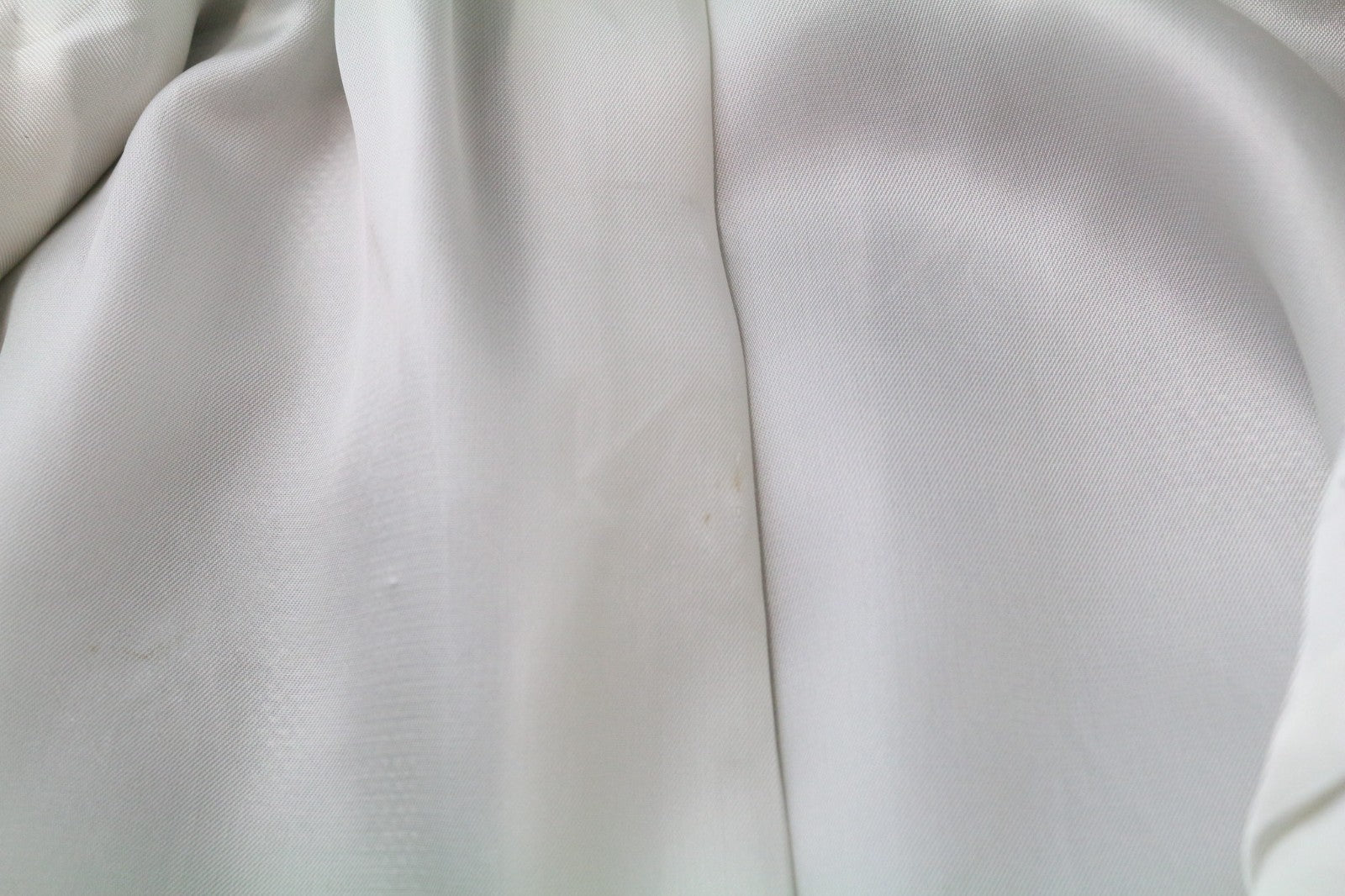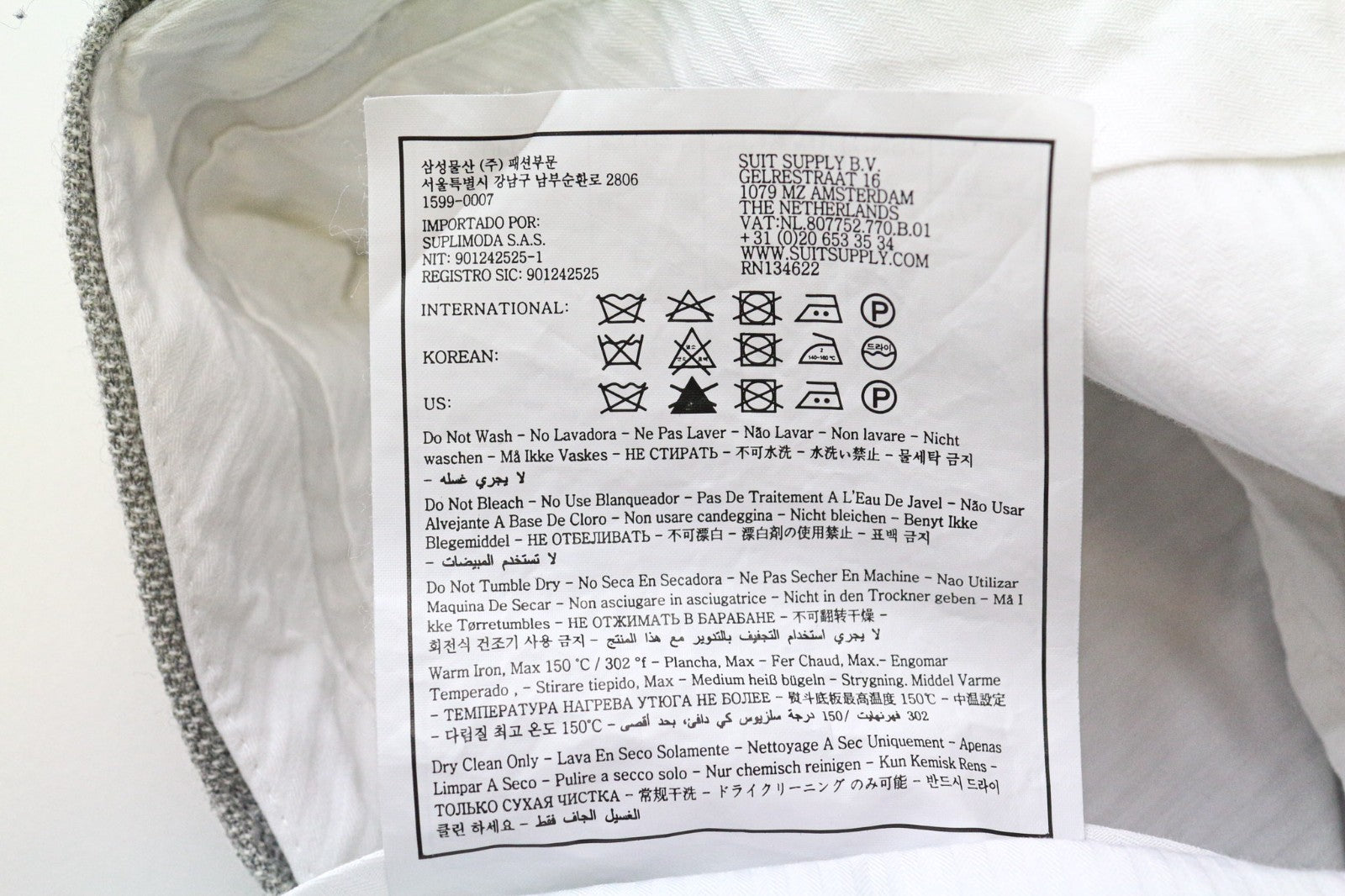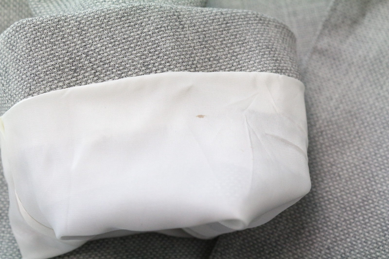 Condition: Used. Stained blazer's lining and inside the right cuff. Rubbed off fabric around the crotch area. Broken stitching at the hems. Please see added photos.