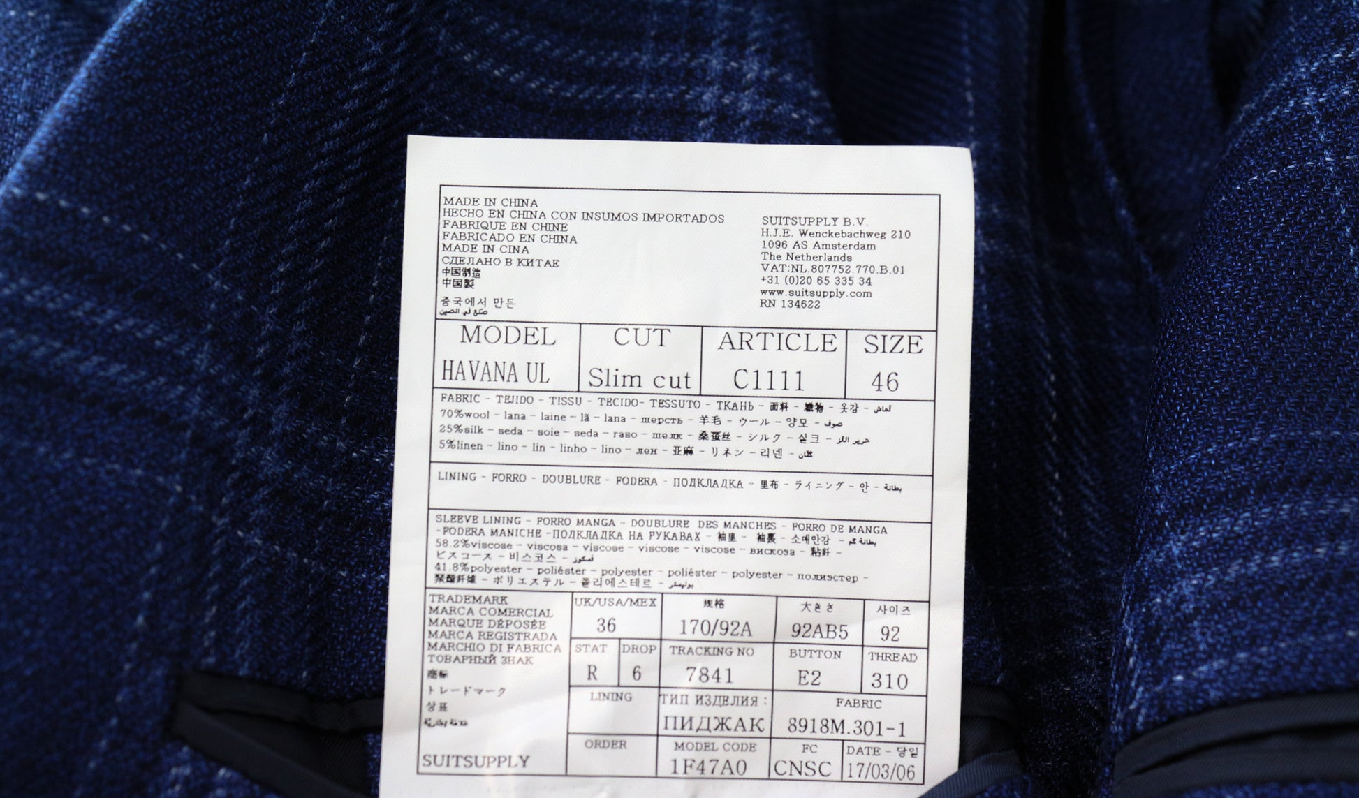SUITSUPPLY Havana Men's Blazer UK36R Checked Blue Wool Silk Linen Slim Fit