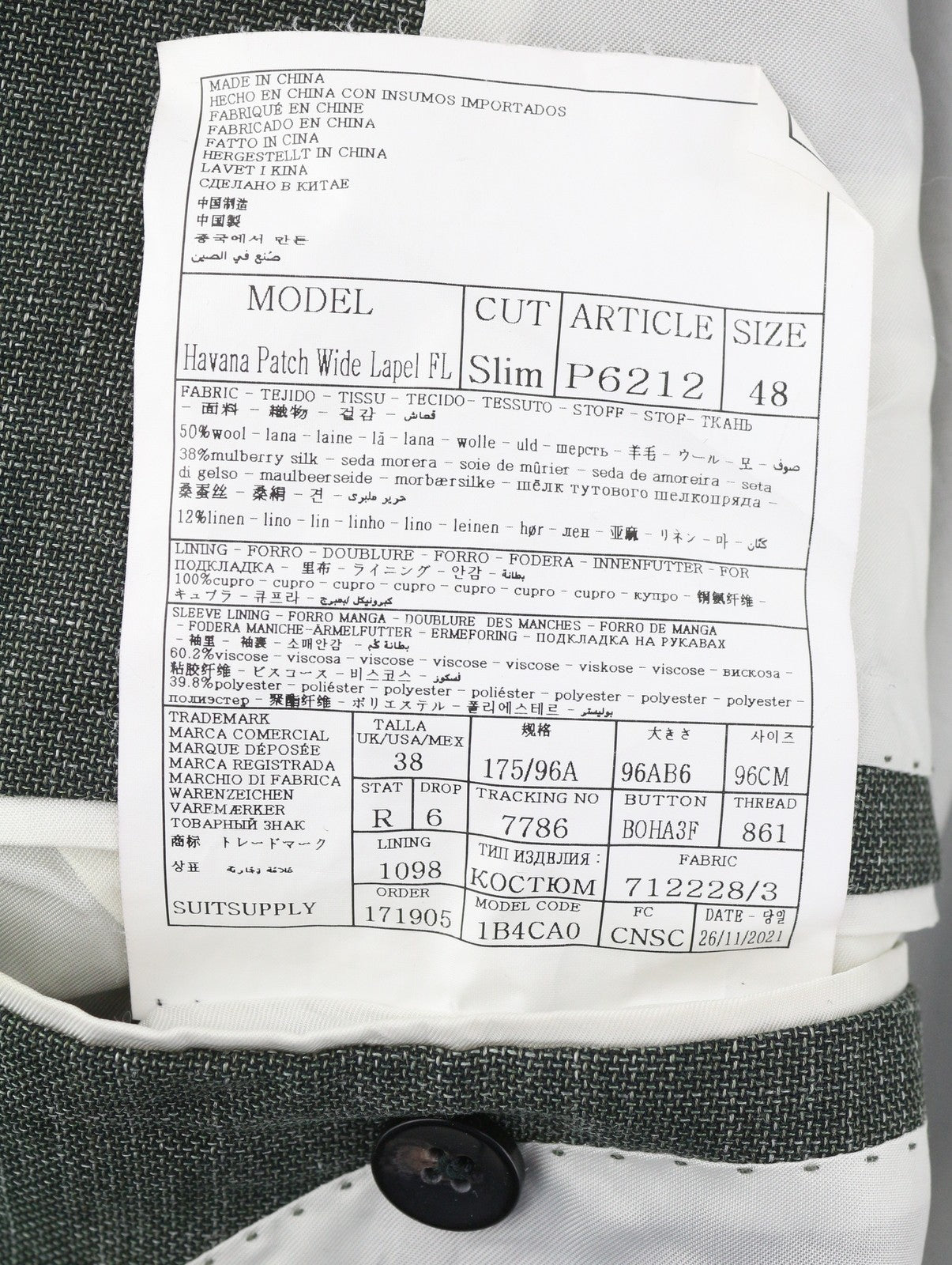 SUITSUPPLY Havana Patch Wide Lapel FL Men Suit UK38R Green Wool Silk Linen 2in1