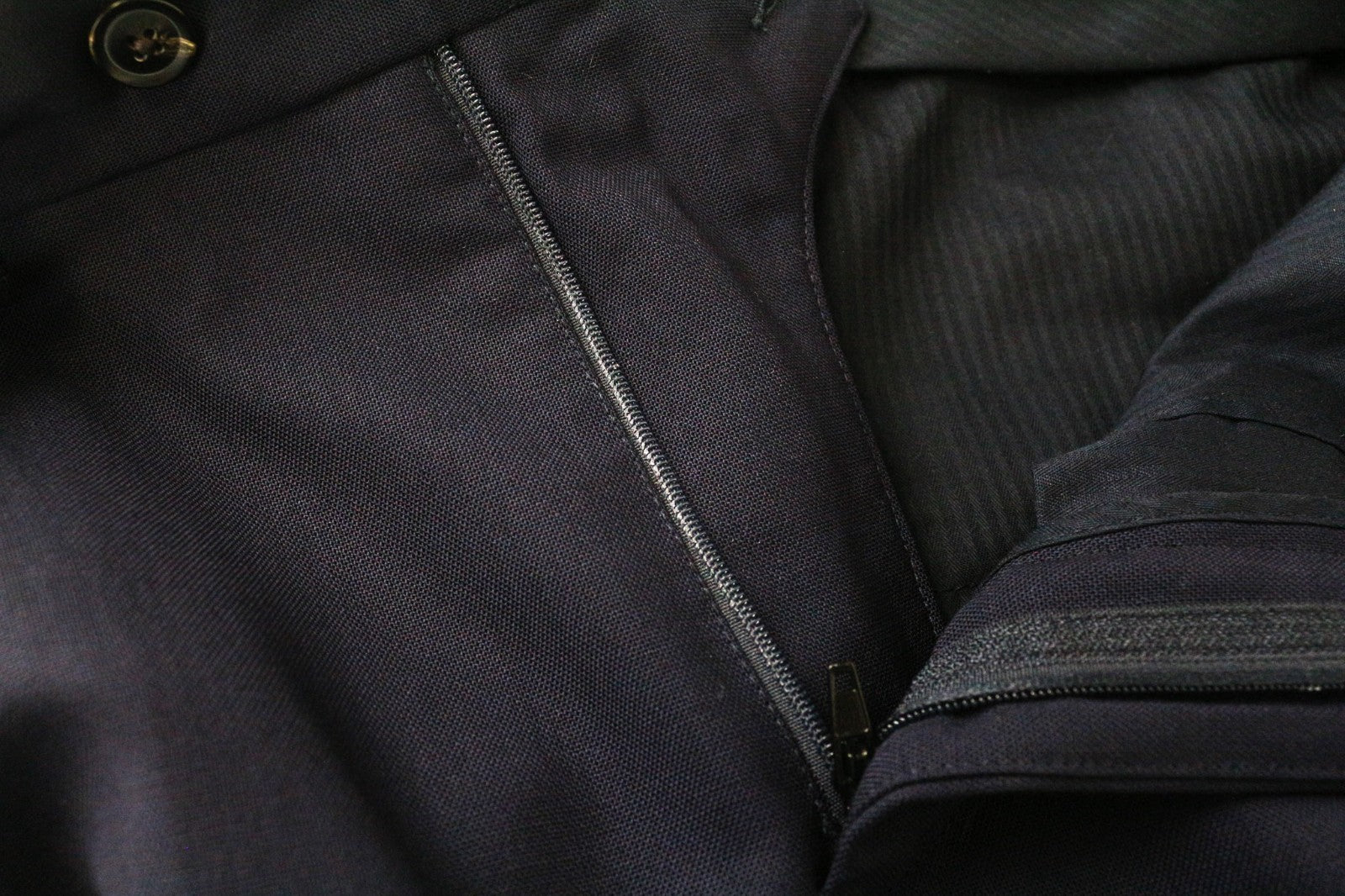 CONDITION: Changed zipper, mended waist and hems, stain on the right leg. Tears in the lapel. Please see added photos.