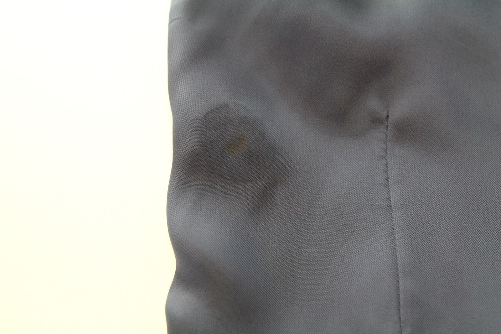 Some pulled out threads on the blazer. Stained lining inside both cuffs of the blazer. Stained waistcoat's back. Slight tear on the blazer's back. Please see added photos.
