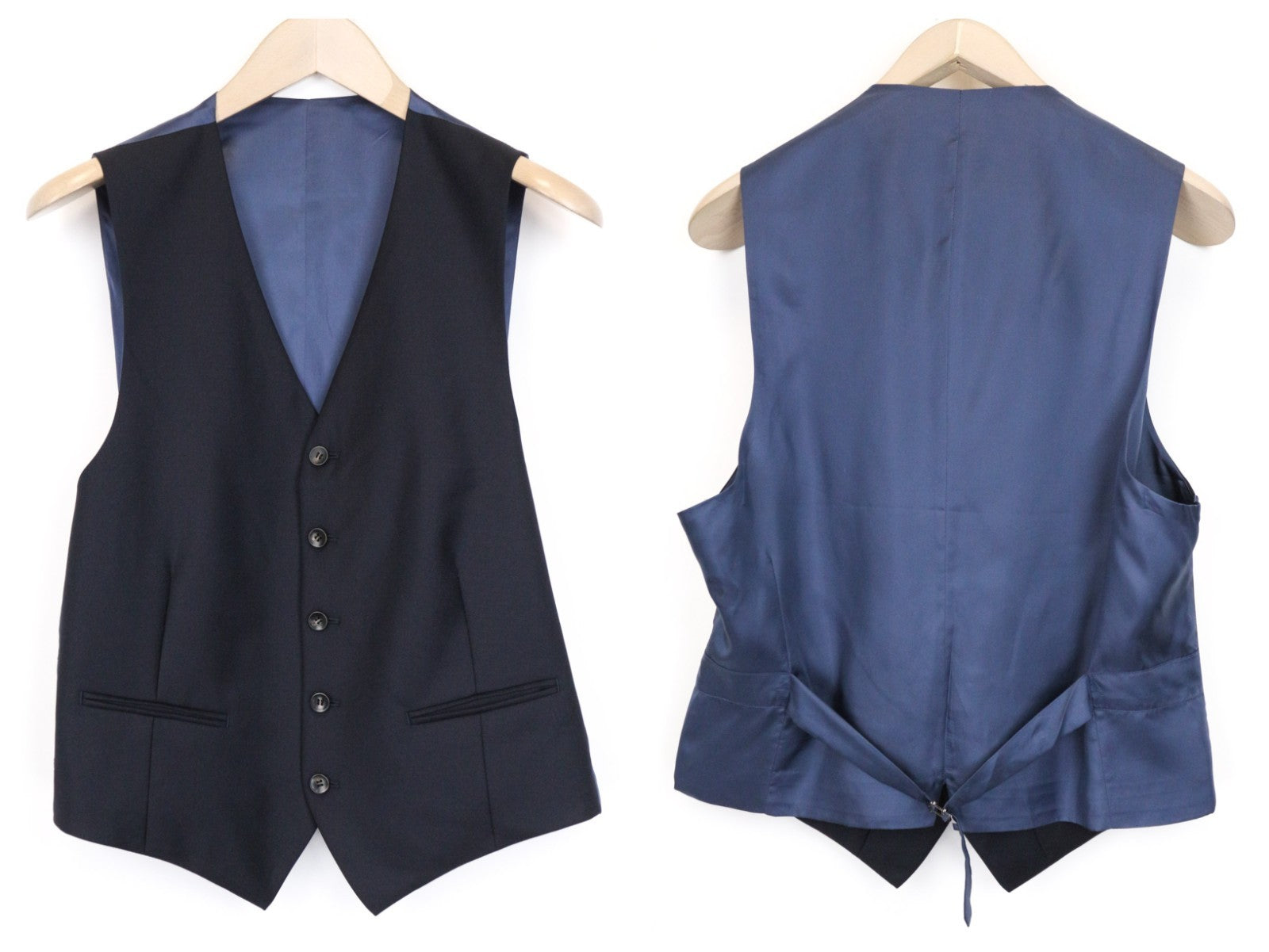 CONDITION: Some pulled out threads on the blazer. Stained lining inside both cuffs of the blazer. Stained waistcoat's back. Slight tear on the blazer's back. Please see added photos.