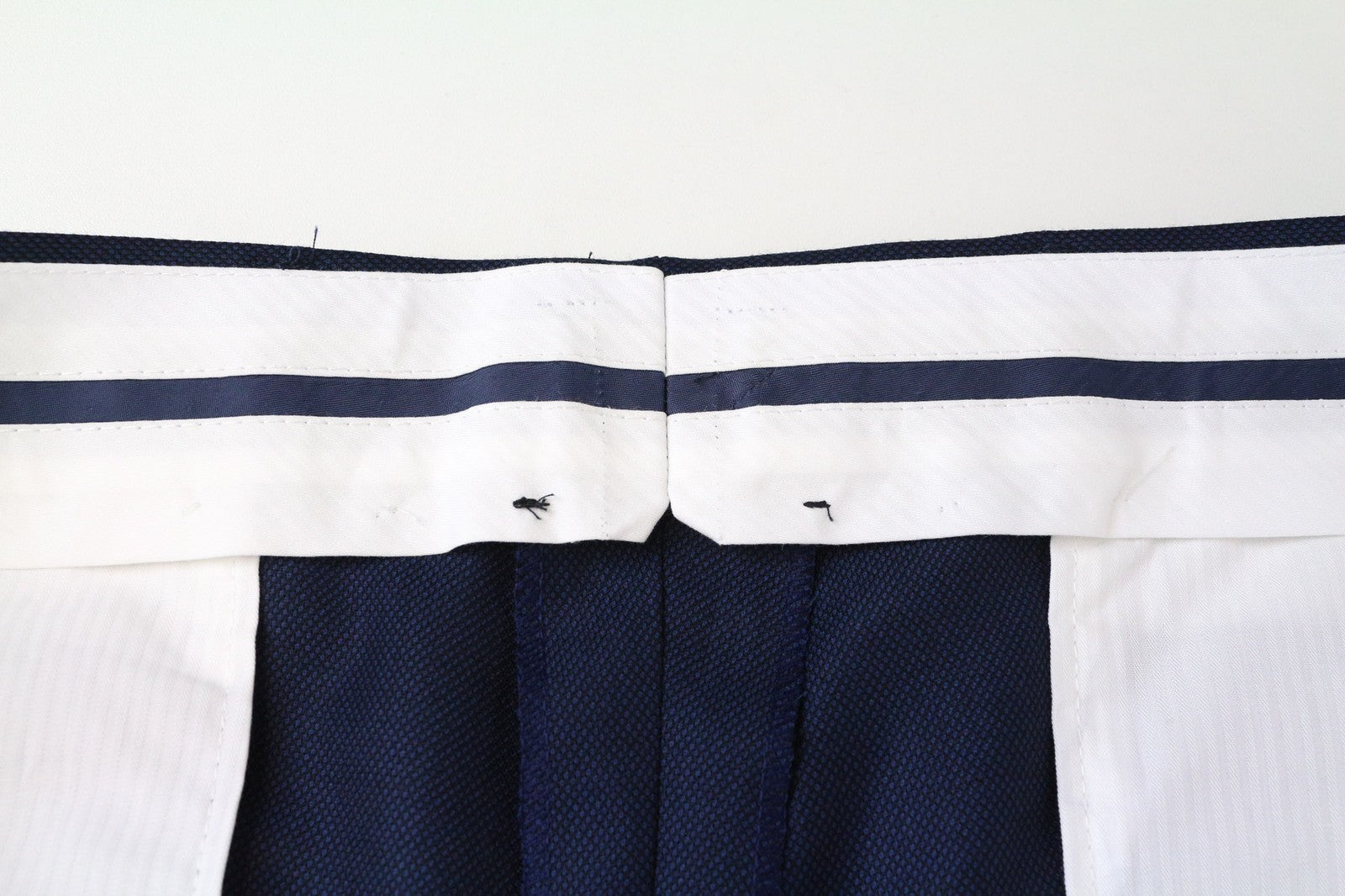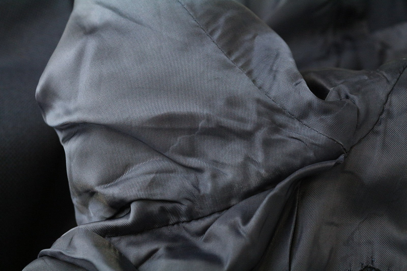 Condition: Mended hems and waistline, stains on the inside. Pulled threads on the blazer's front, stained armpit area on the inside. Please see added photos.