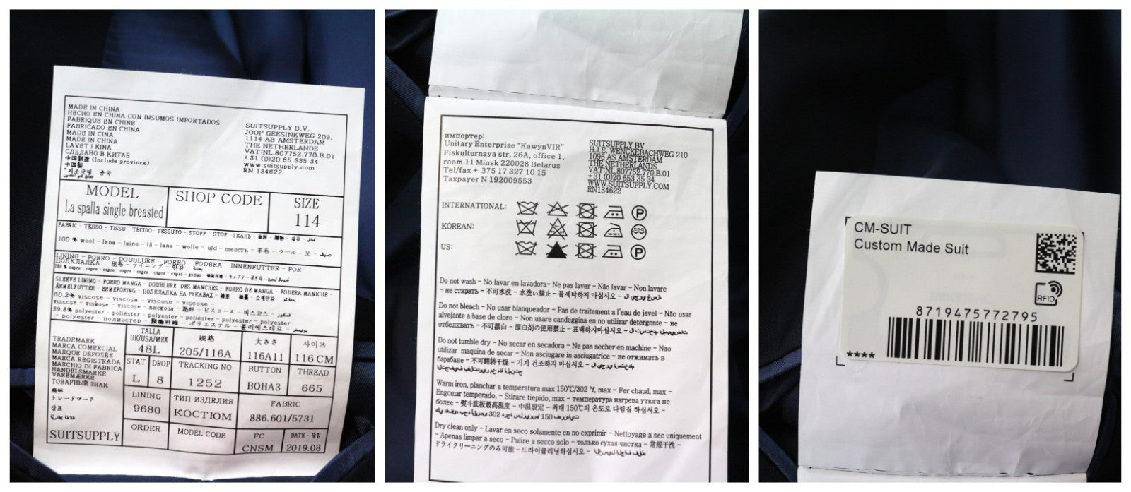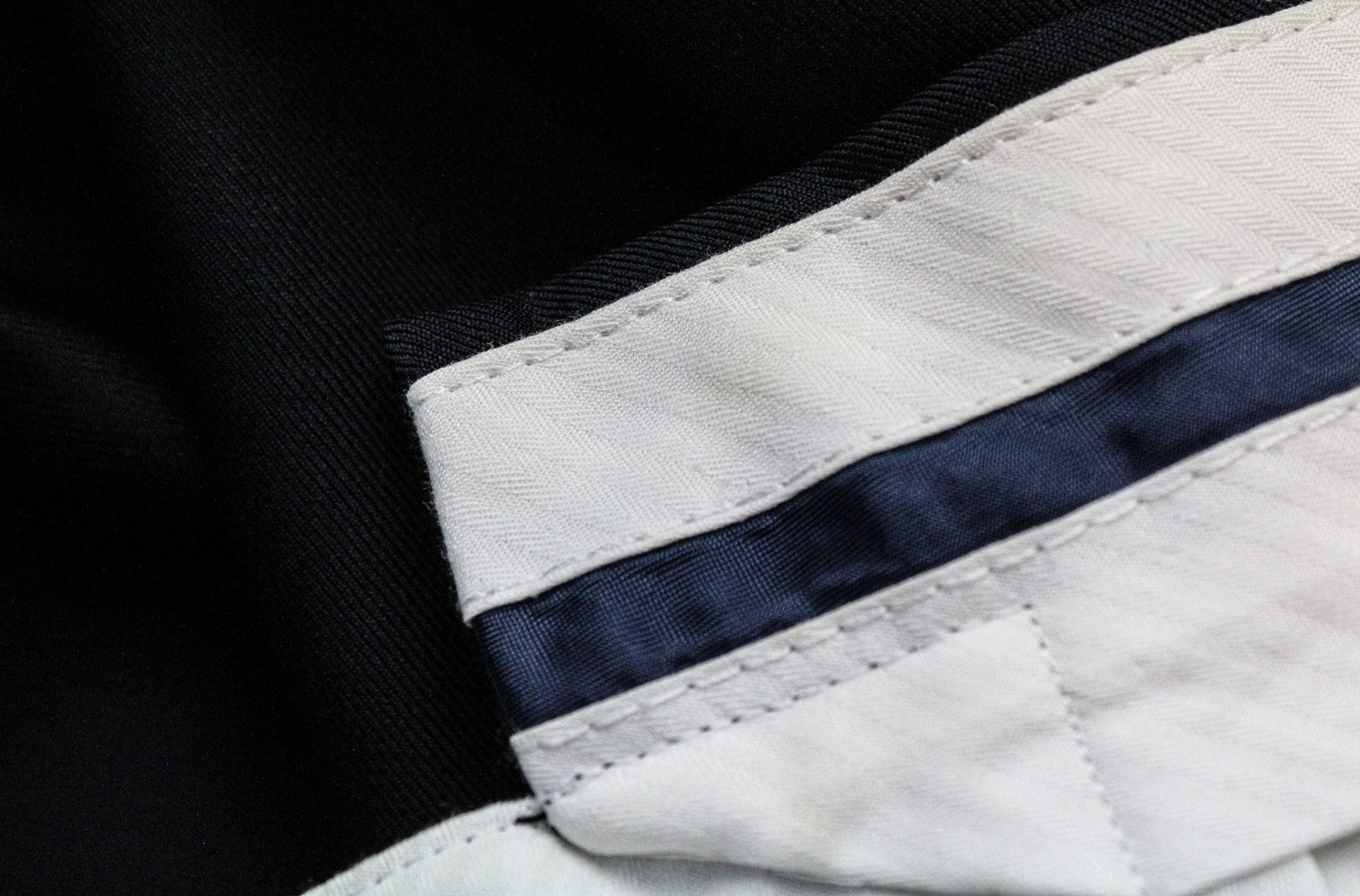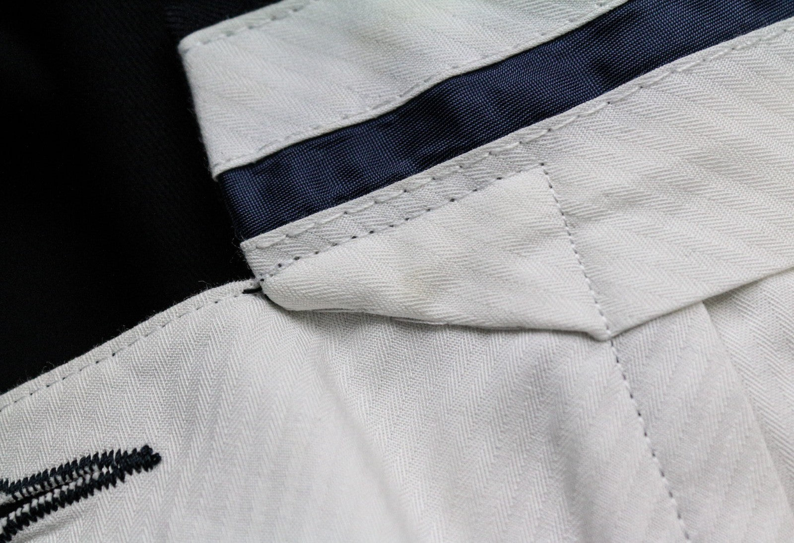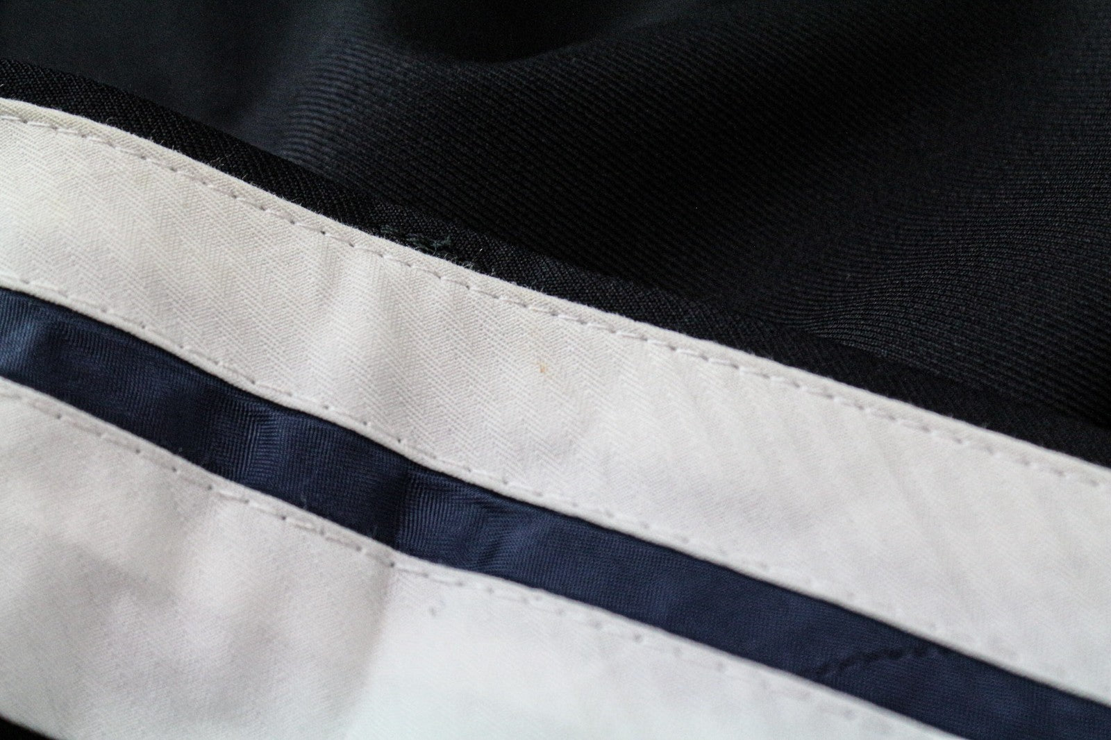 CONDITION: Used. A few pulled threads - on the blazer's back and on the right leg. Stained trousers' waistline and waistcoat's back. Please see added photos.