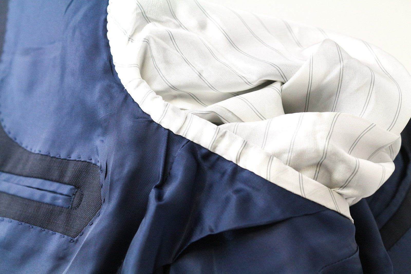 Used. Tailored around the shoulders, trousers' length, and waistline width. Slight tears on the blazer's inside. Stained trousers on the inside. Please see added photos.