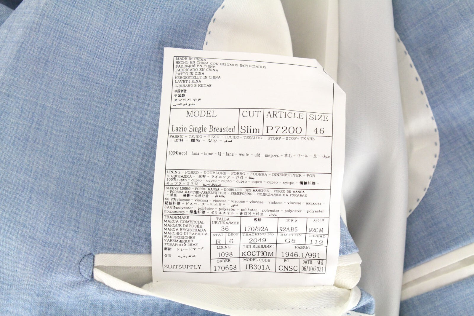 SUITSUPPLY Lazio Men's Suit UK36R Slim Wool Melange Light Blue 2-Piece