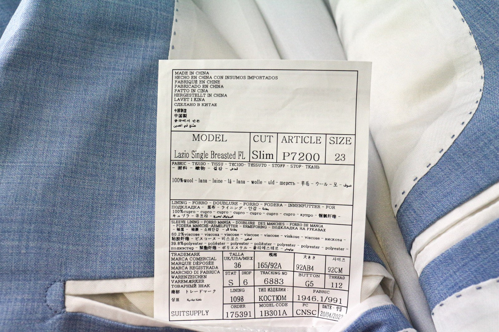 SUITSUPPLY Lazio Men's Suit UK36S Light Blue Pure Wool Slim 2 Piece Classic Set