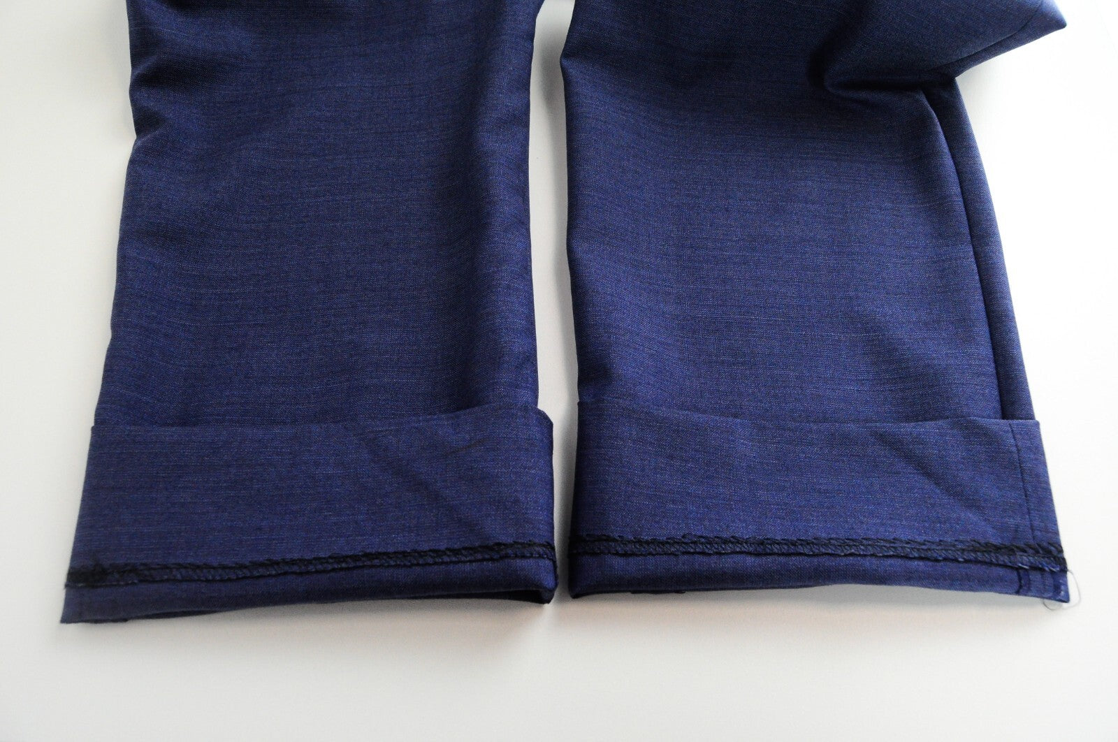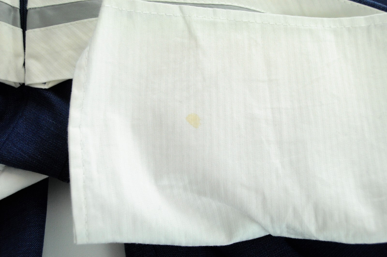 Mended sleeve and hems lengths. Mended crotch middle seam. Stained lining of the left back pocket. Stain around the inner seam of the left leg. Please see added photos.