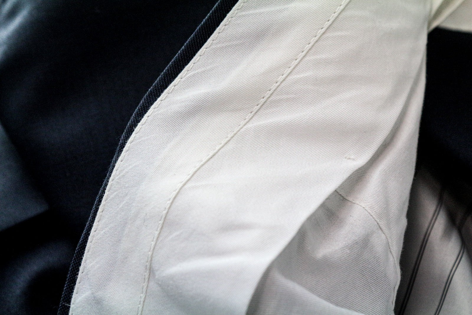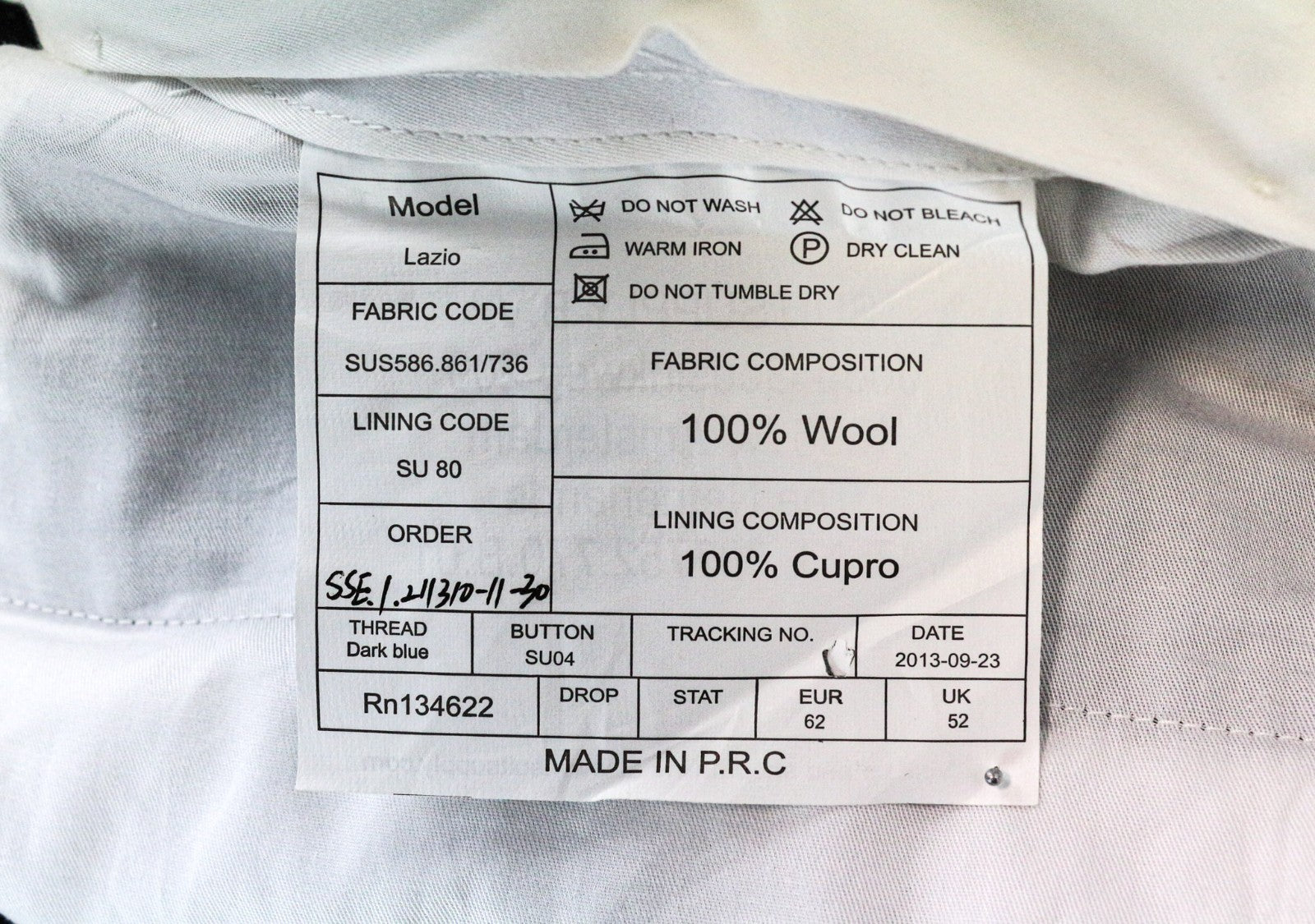 Condition: Used. Stained waistline. Slightly thinned out/rubbed off fabric around the middle trousers' seam. Tailored trousers' length. Please see added photos.