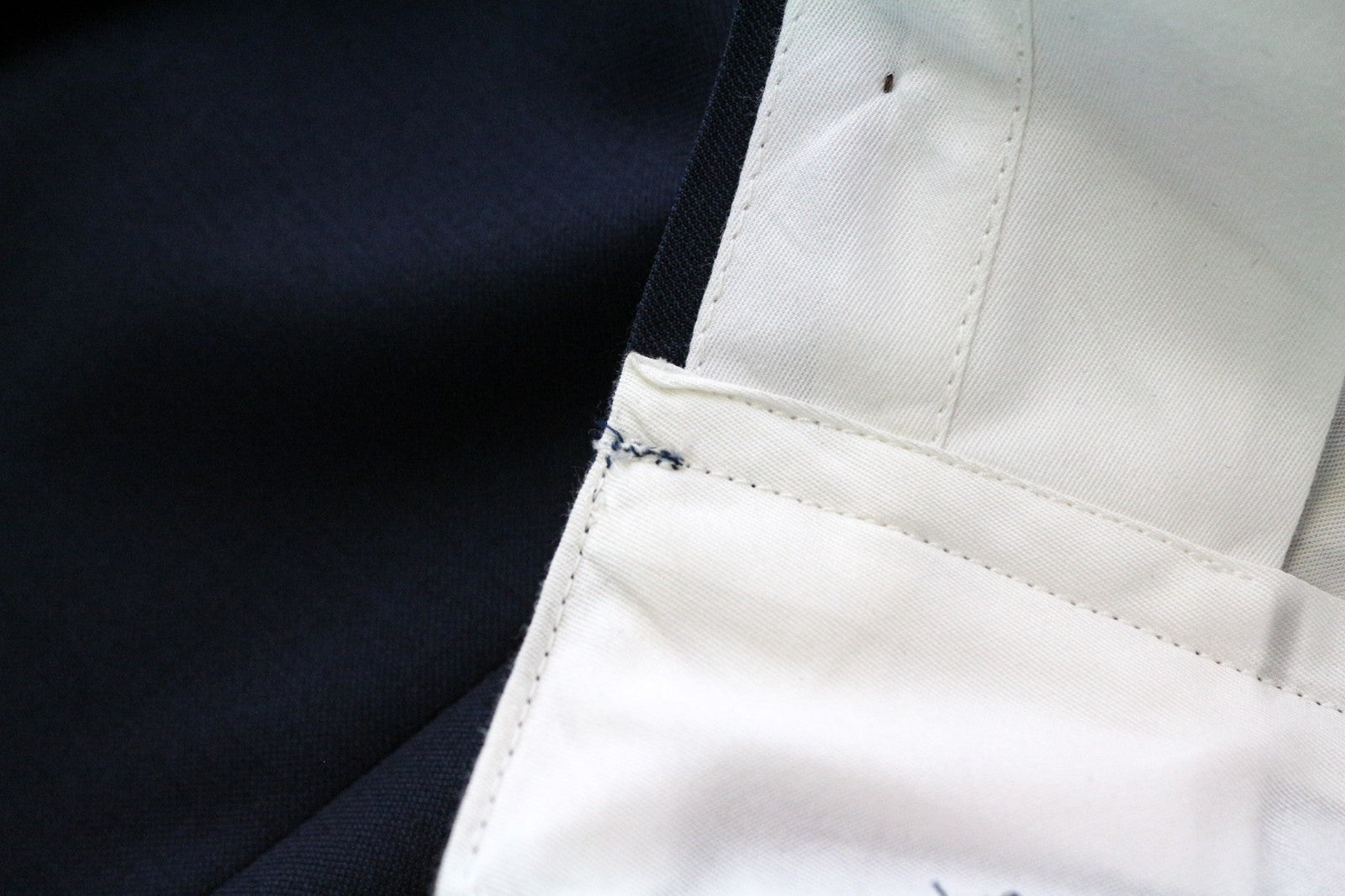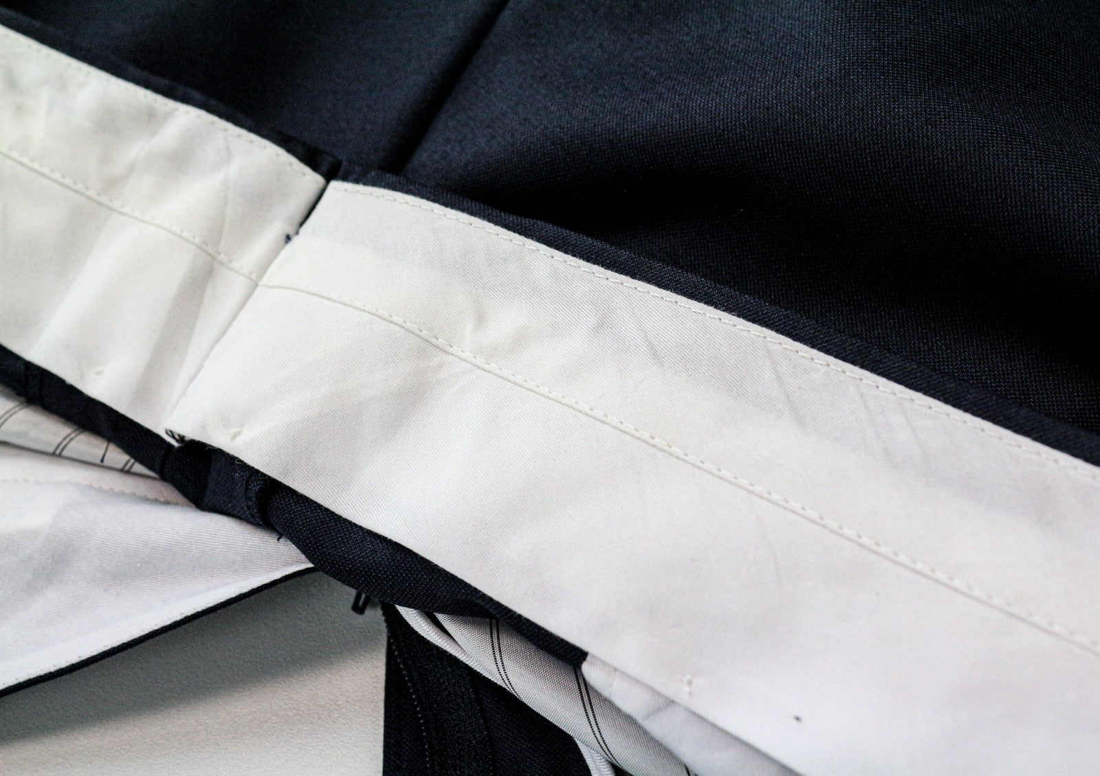 Used. Stained waistline. Slightly thinned out/rubbed off fabric around the middle trousers' seam. Tailored trousers' length. Please see added photos.