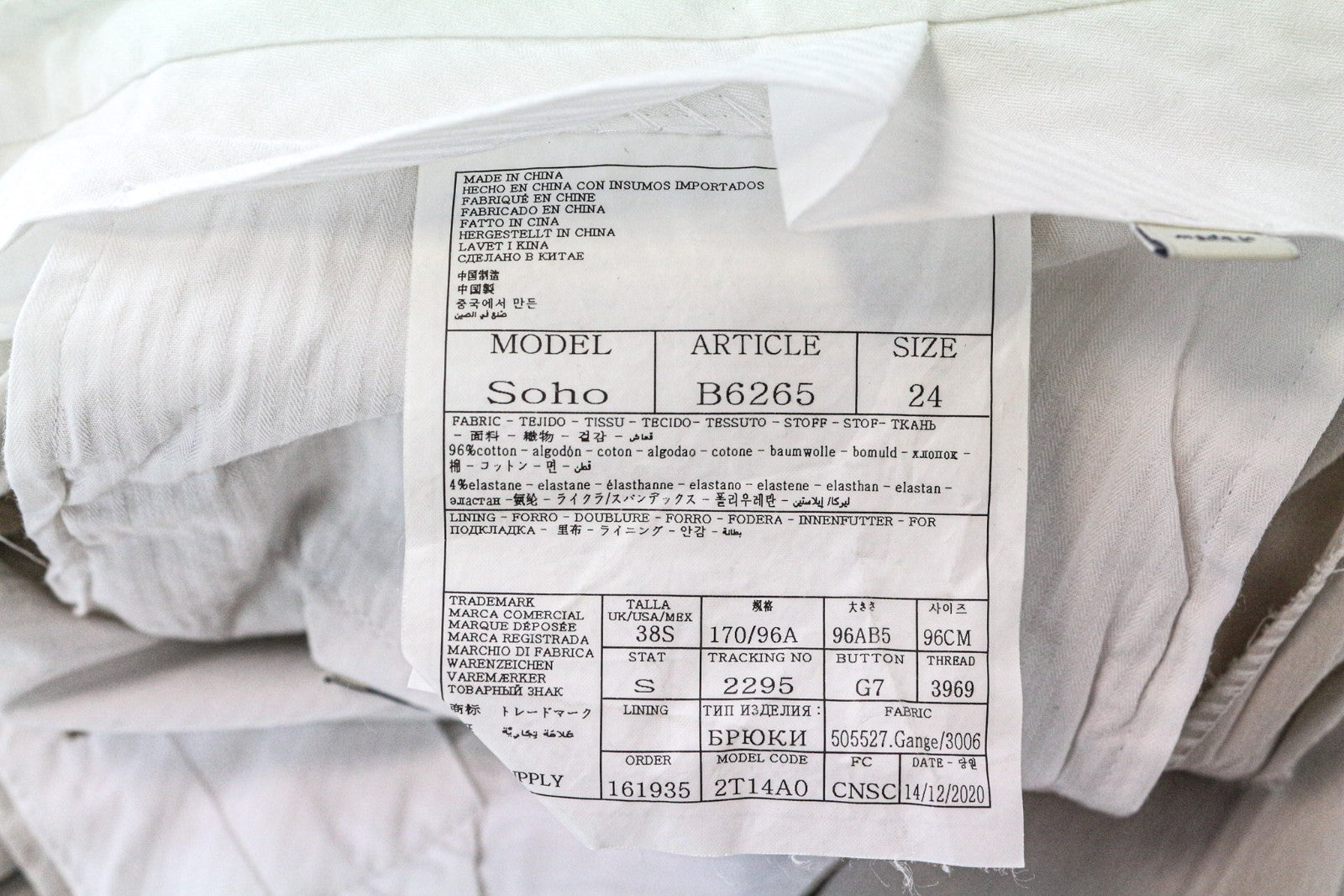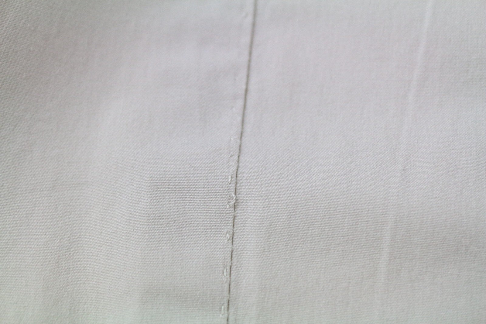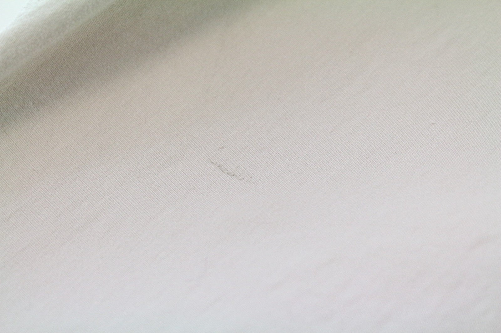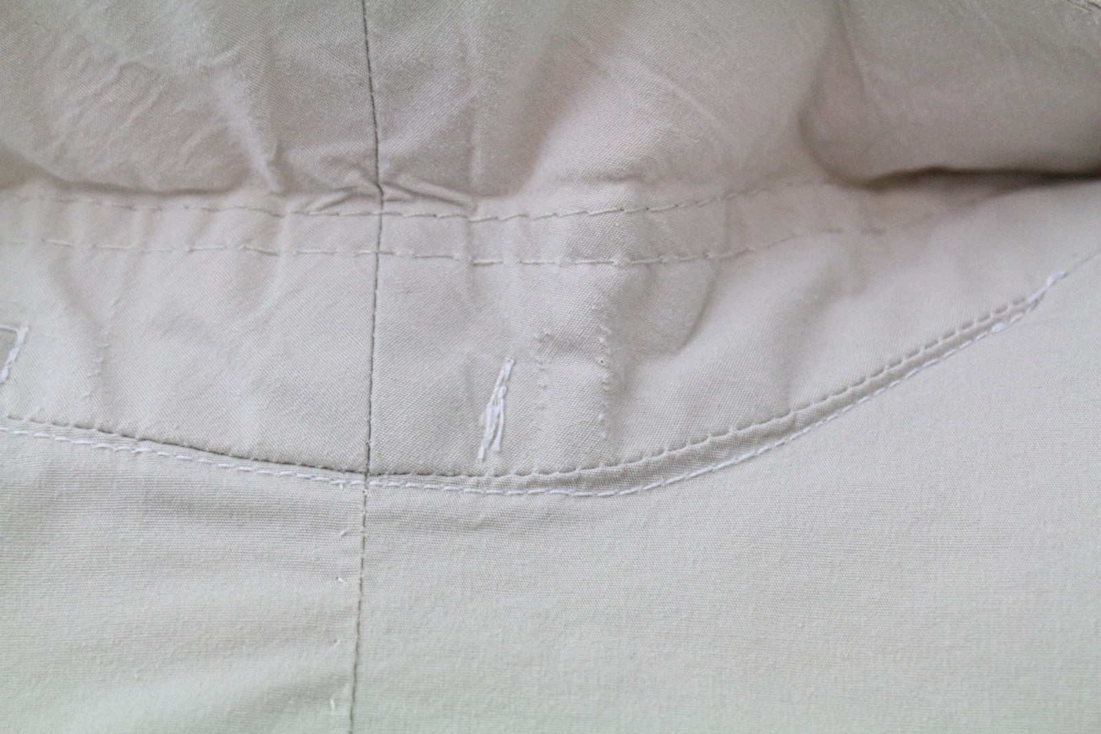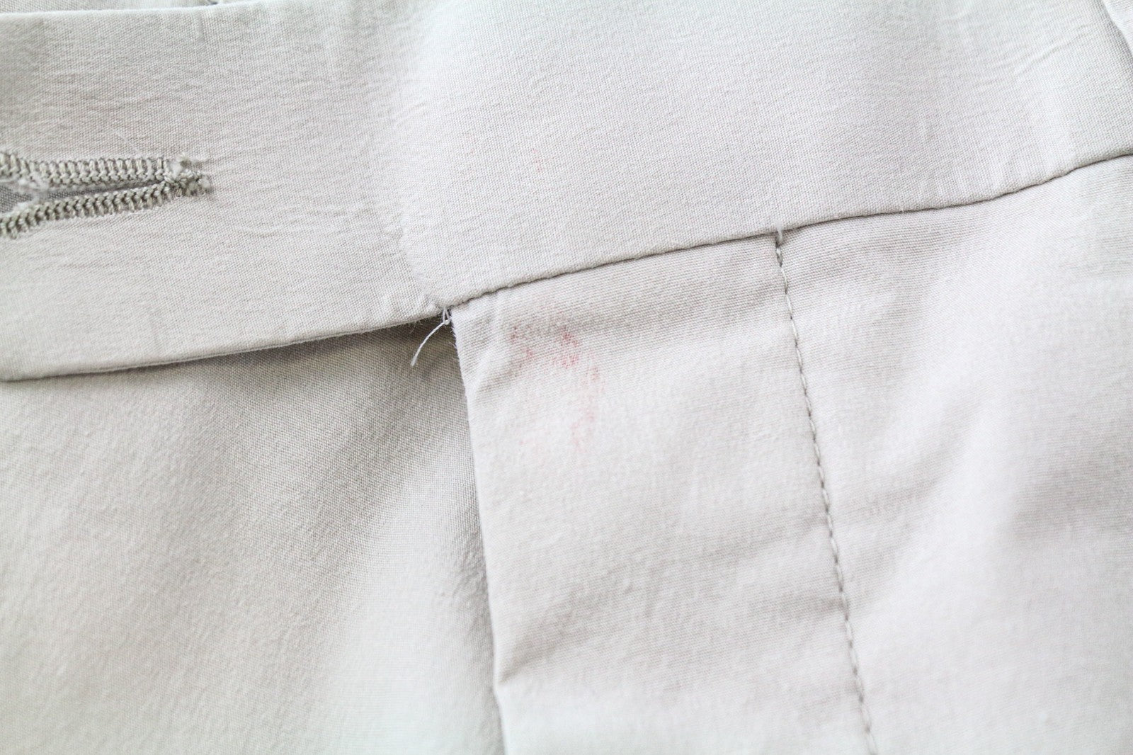 CONDITION: Used. Needle cut holes around the brand's label and underneath the collar. Stained neckline, left sleeve, around the front buttons, both cuffs, around the crotch area. Please see added photos.
