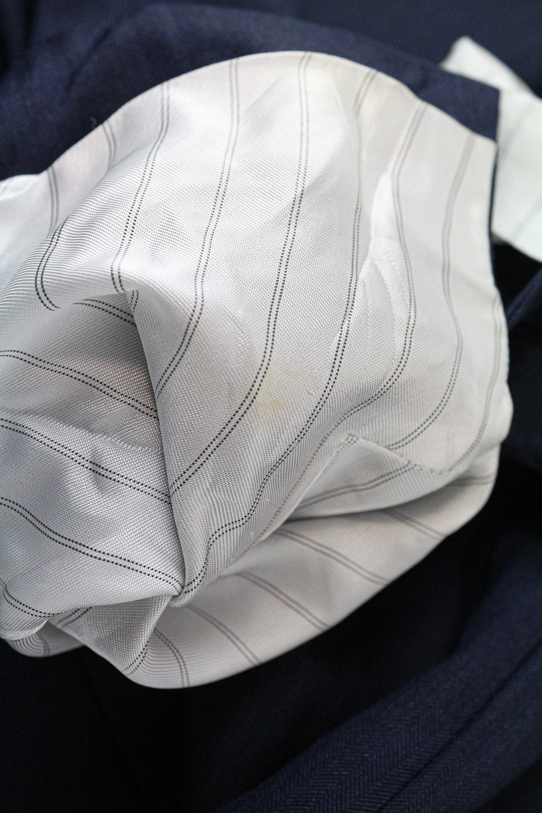 Condition: Used. Wearing marks around the armpits. Stained inside the cuffs. Pulled thread on the back. Please see added photos.