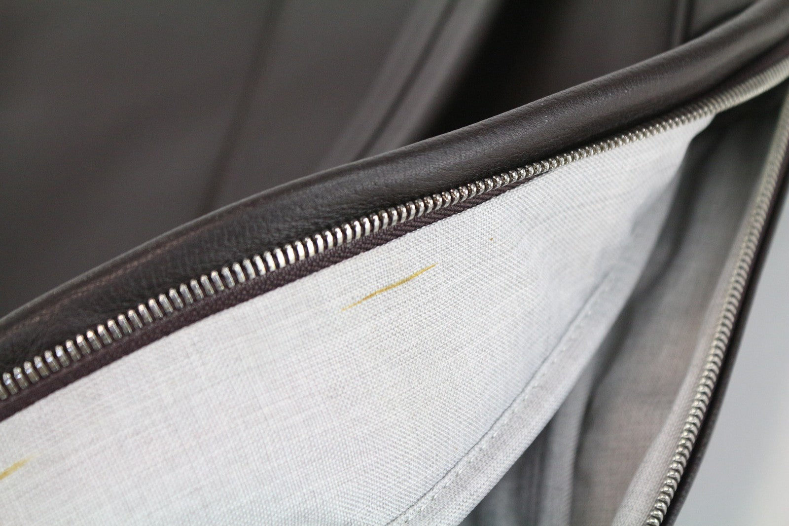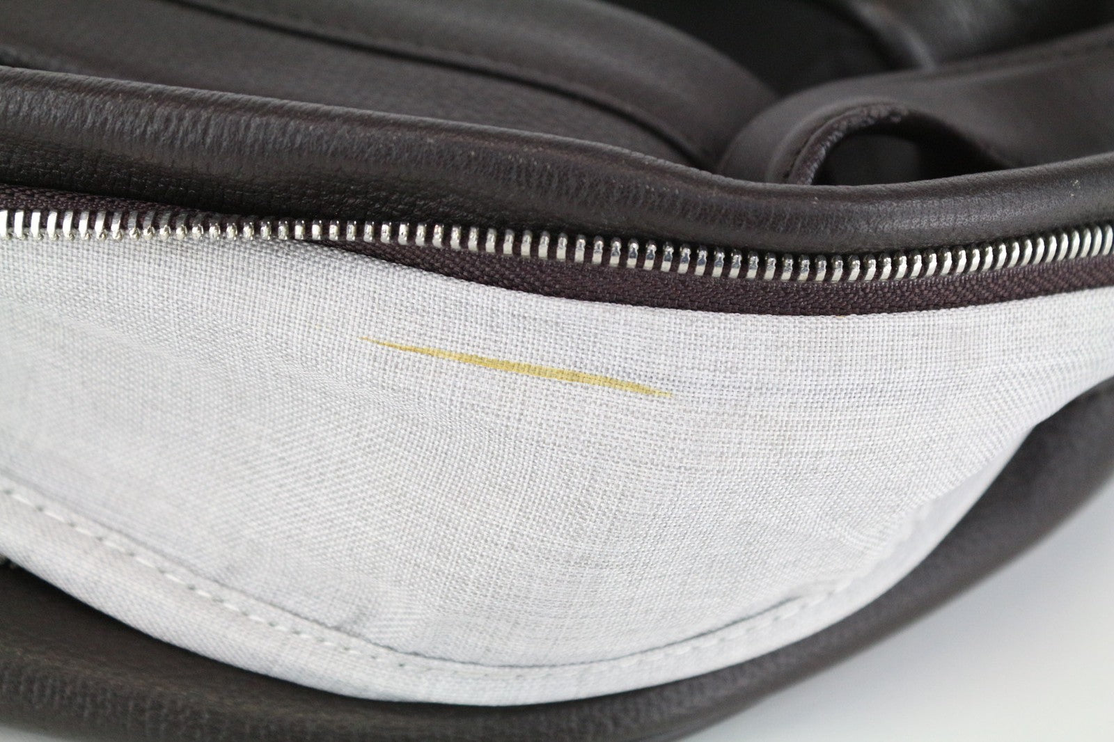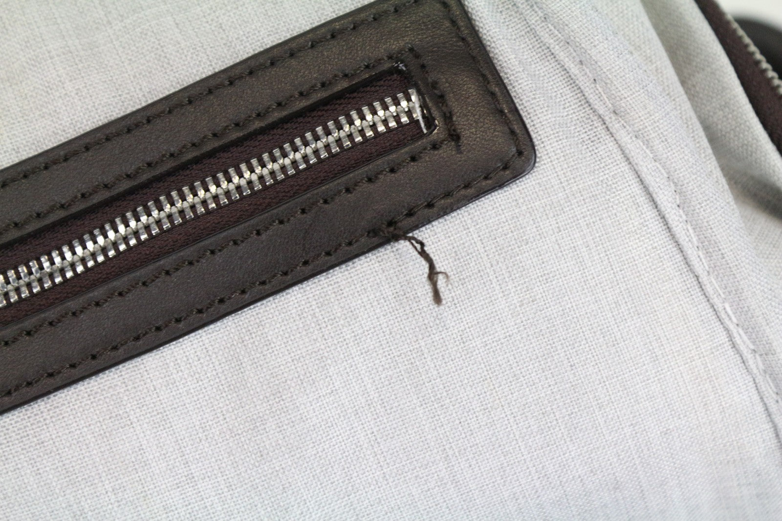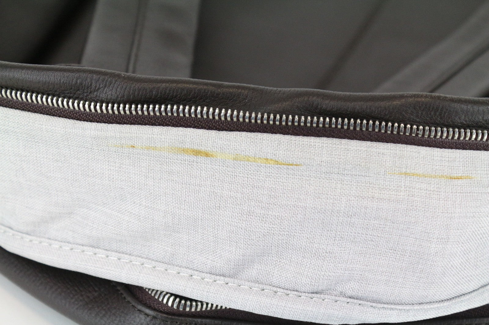 Condition: Used. Stained around the zipper. The main zipper doesn't work as smoothly as it should. Rubbed off leather surface of the outer shell and backpack's handle. Please see added photos.