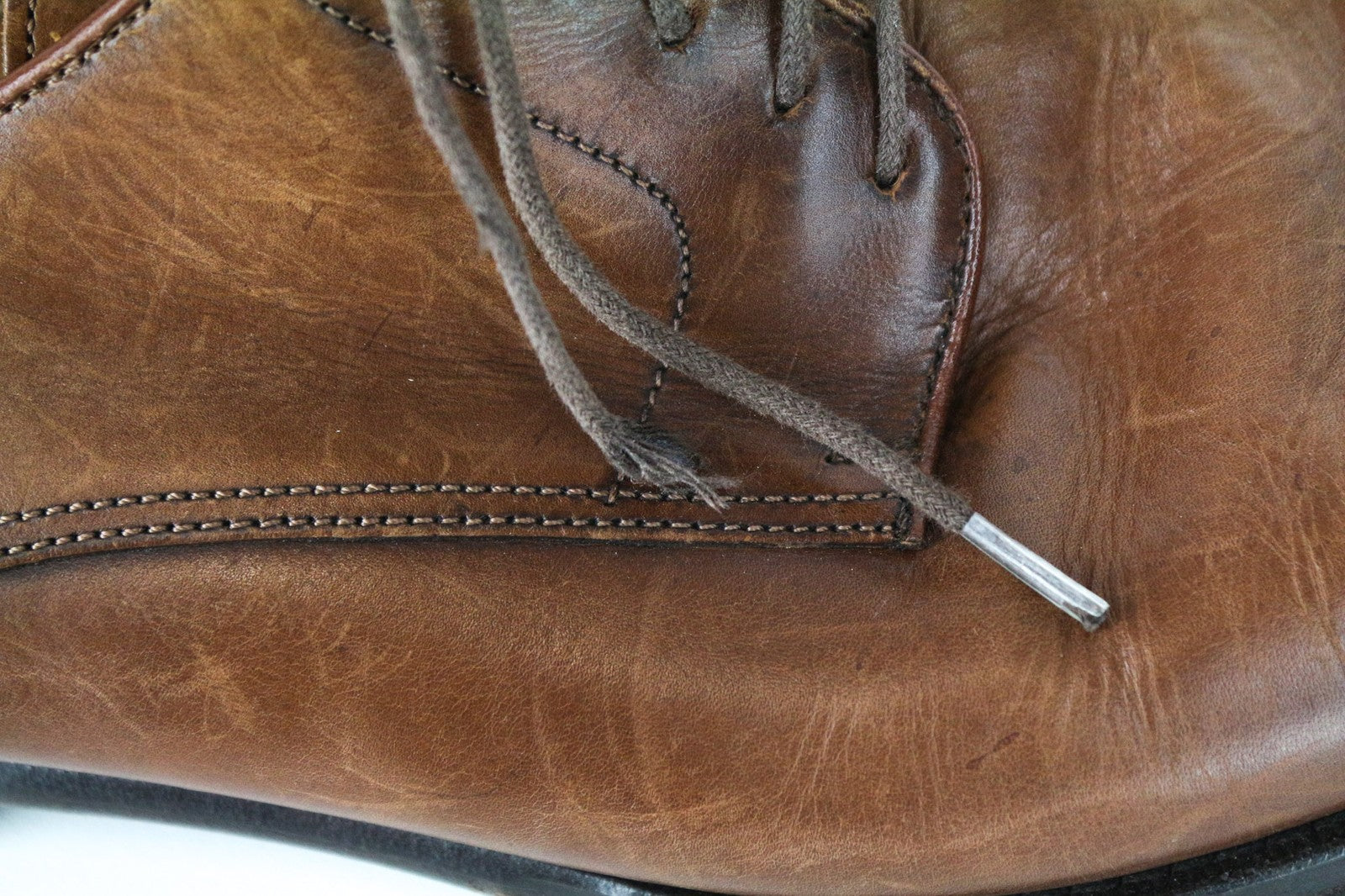 CONDITION: Used. Has wrinkles, dents, rubbed off marks, stains and scratches. Tear in the left shoe, broken right shoe's lace. Please see added photos.