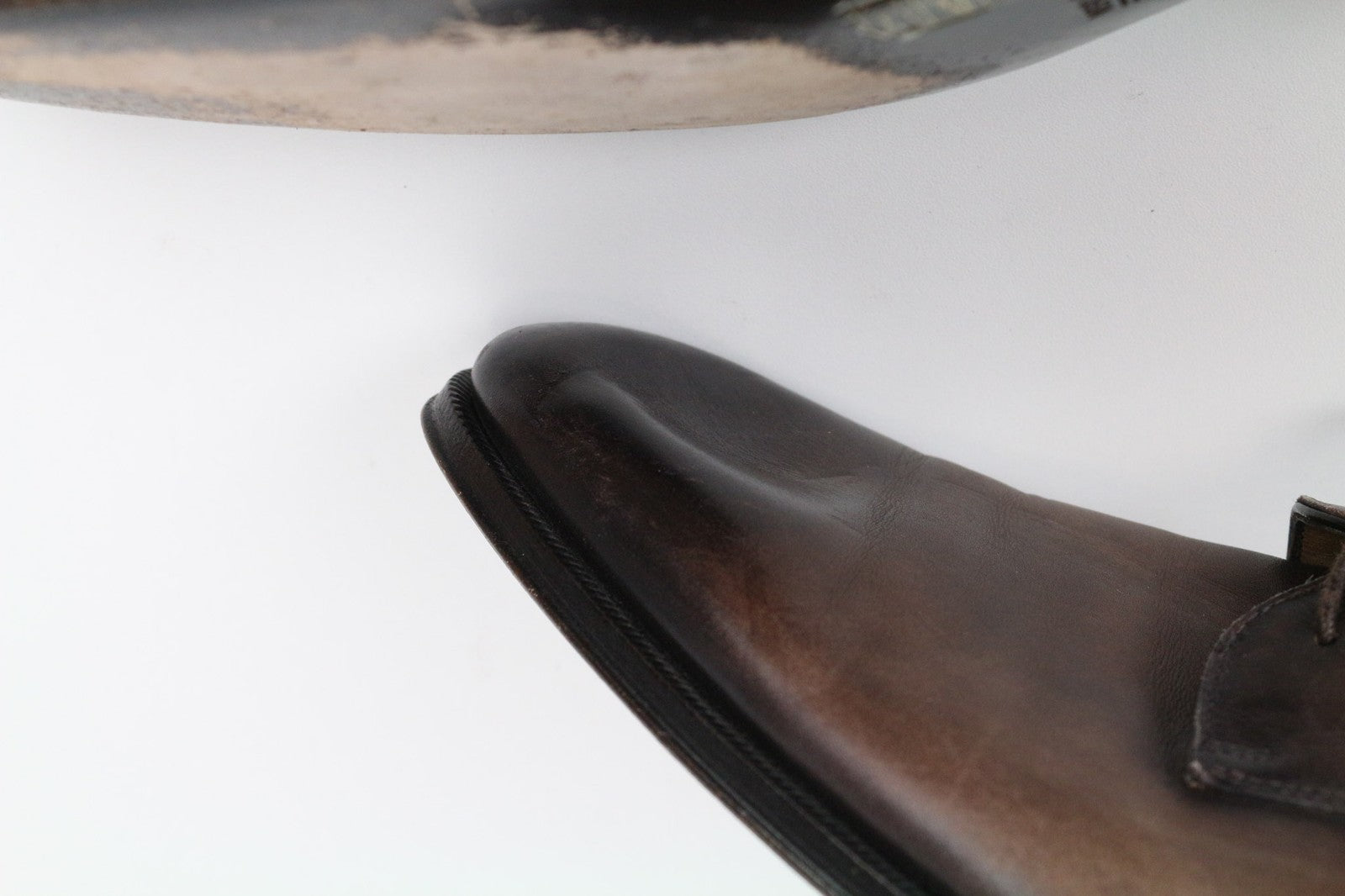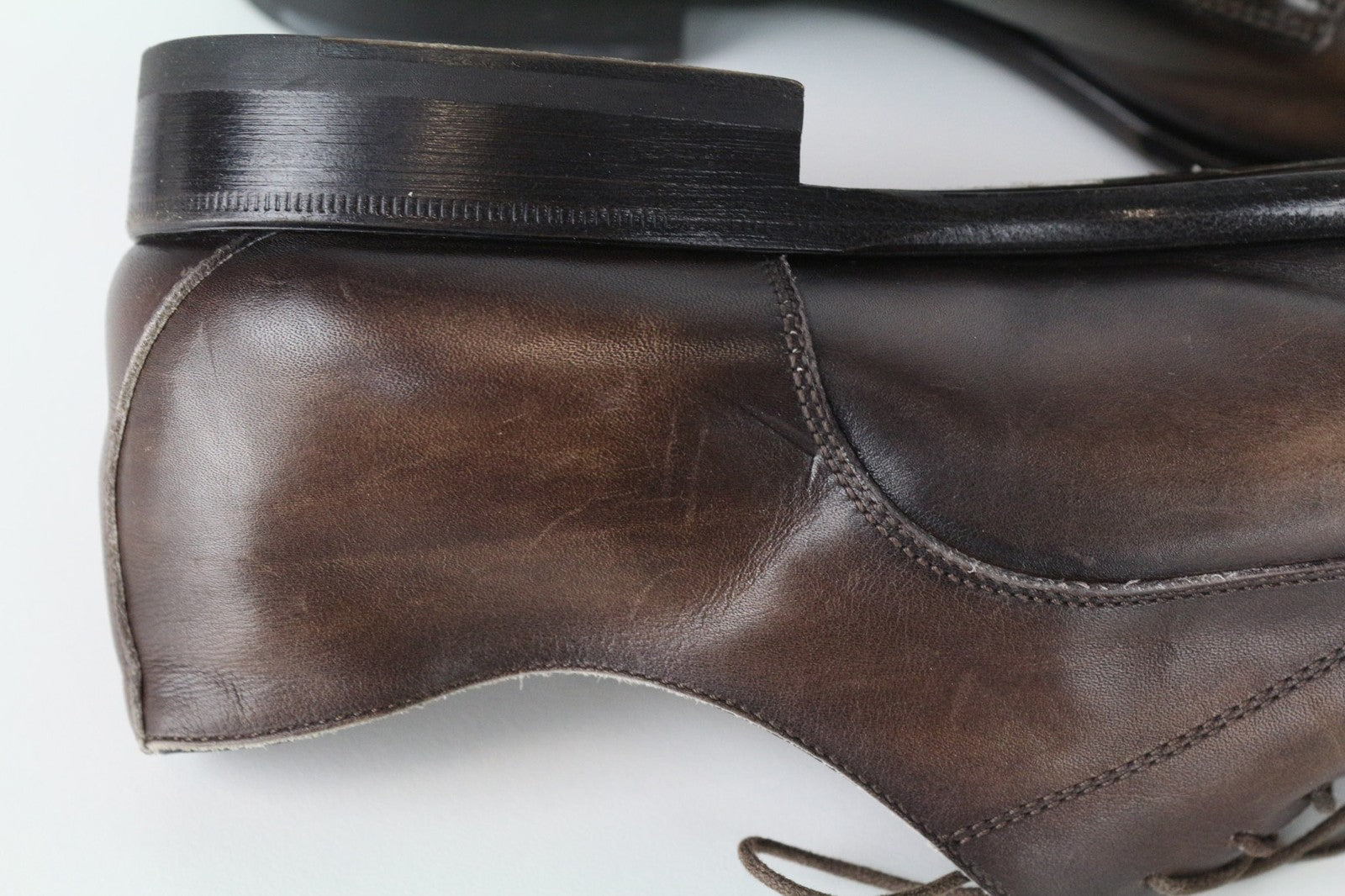 CONDITION: Used. Wrinkly, scratched uppers, with some pressure marks. Torn shoelaces of the right shoe. Please see added photos.