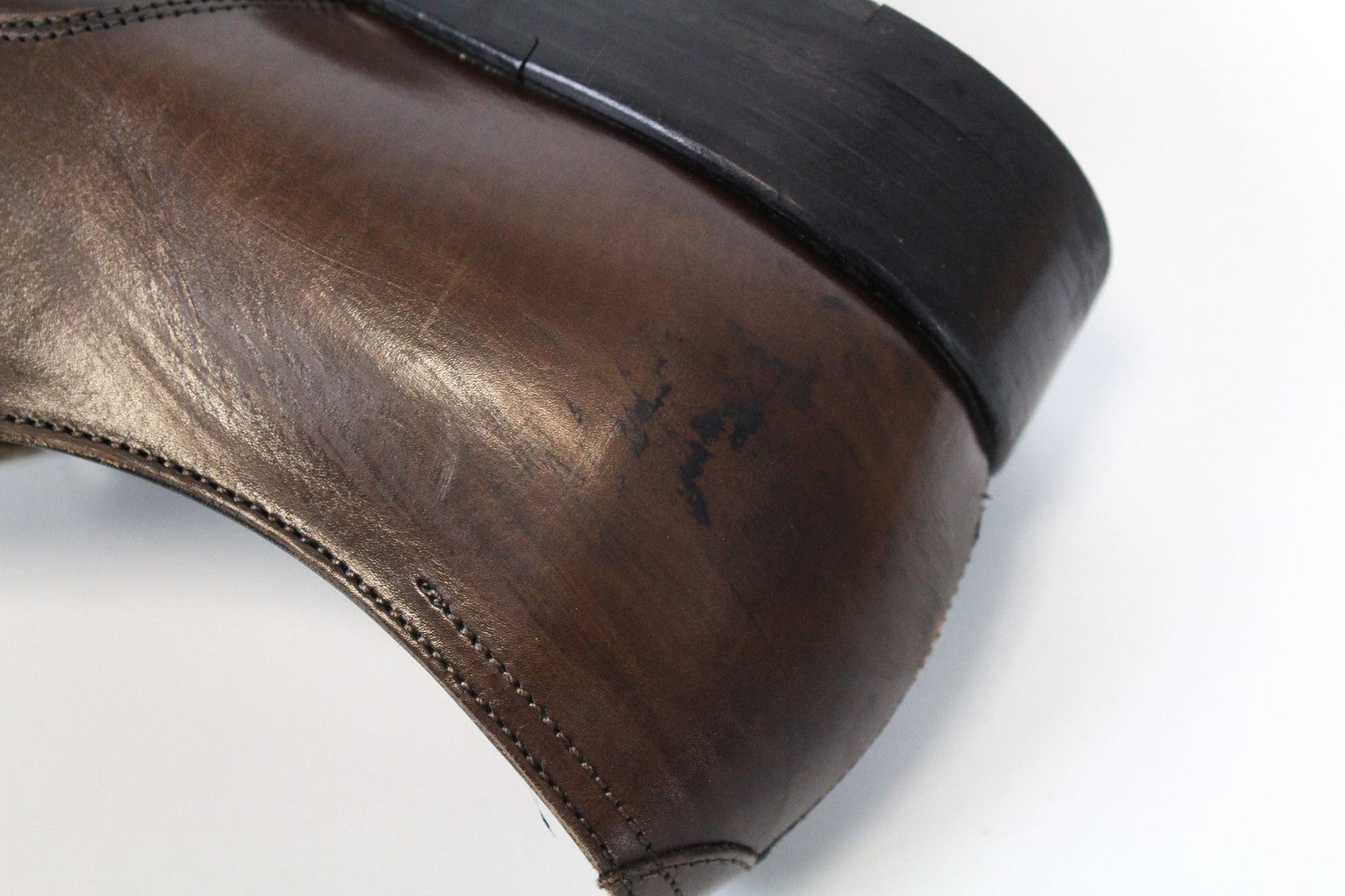 CONDITION: Used. Rubbed off soles. Has wrinkles, imprints, scratches and stains. Please see added photos.